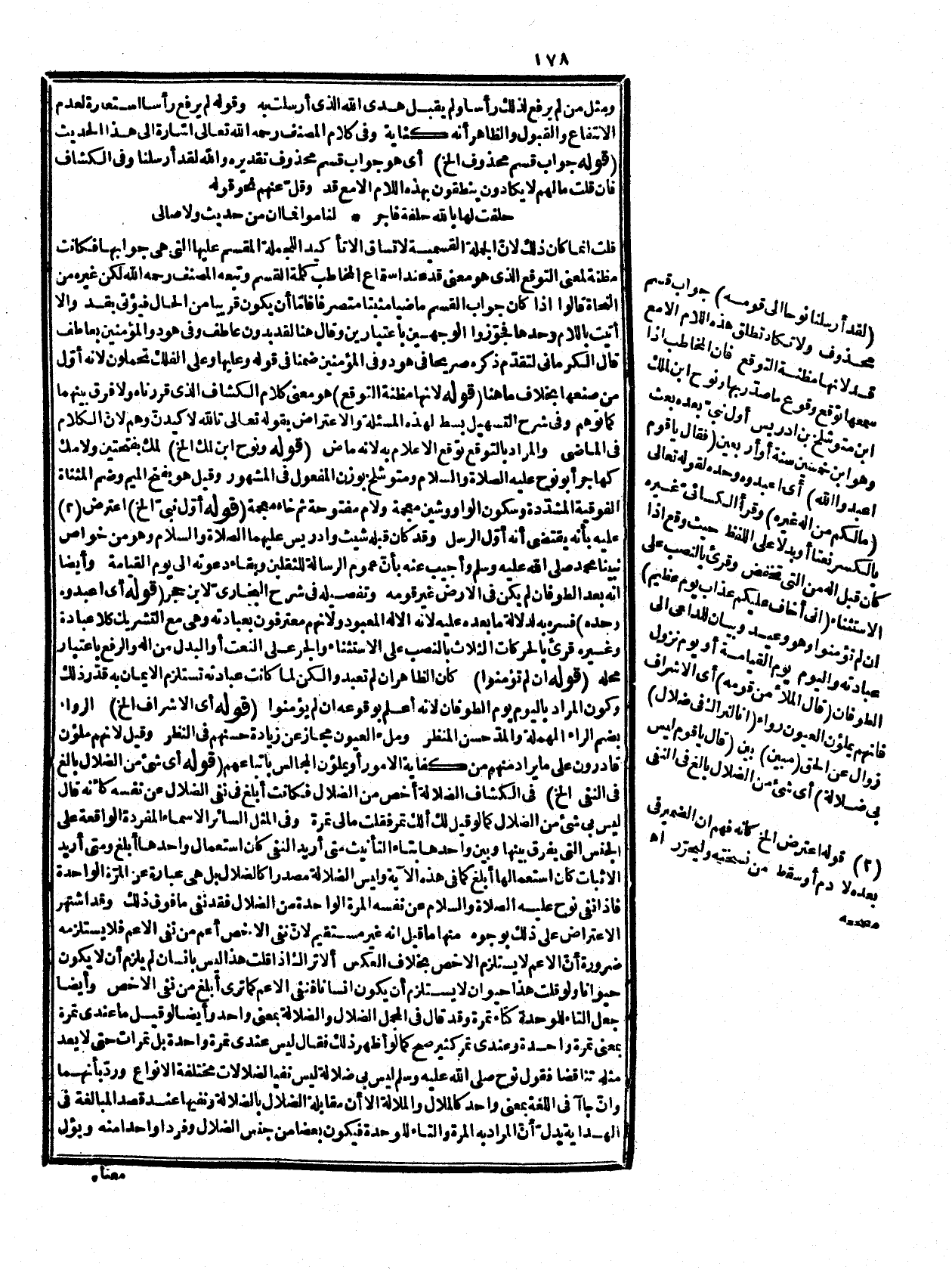اهتداء ولا ضلال، وقال النحرير: متعقبا له إن كان القصد إلى مجرّد كون لكن يتوسط بين كلامين متغايرين نفيا واثباتاً فوجه السؤال والجواب ظاهر، وأمّ إذا أريد بالاستدراك رفع التوهم الناشئ من الكلام السابق على ما هو المشهور، وعلى ما قاله المصنف رحمه الله تعالى معنى الاستدراك أنّ الجملة التي يسوقها أولأ يقع فيها وهم للمخاطب فيتدارك ذلك الوهم بإزالته، كقولك زيد ليس بفقيه ولكته طبيب، ففي الكلام إشكال لأن نفي الضلالة ليس مما يقع فيه نفي كونه رسولأ، وعلى صراط مستقيم، وما في الكتاب غير واف بحله بل ترك ما ذكره من التأويل أولى، إذ يمكن أن يقال ربما يتوهم المخاطب عند نفي الضلالة انتفاء الرسالة أيضاً، لكن توهم انتفاء الهداية مما لا وجه له إذ من البعيد أن يقال نفي الضلالة، ربما يوهم نفي سلوك الطريق المستقيم، وحيث لا سلوك لا هداية، كما لا ضلالة والظاهر أن المصنف رحمه الله تعالى لم يقصد سوى أنه عند نفي أحد المتقابلين قد سبق الوهم إلى انتفاء المقابل الآخر، لا إلى انتفاء الأمور التي لا تعلق لها به، فأول ما وقع في معرض الاستدراك بما يقابل الضلال مثلا يقال زيد ليس بقائم لكنه قاعد، ولا يقال لكنه شارب إلا بعد التأويل بأن الشارب يكون قاعدآ، وقد قيل: إنّ القوم لما أثبتوا له الضلالة أرادوا به ترك دين الآباء ودعوى الرسالة، فهو حين نفي الضلالة توهم منه أنه على دين آبائه، وترك دعوى الرسالة، فوقع الأخبار بأنه رسول، وثابت على الصراط المستقيم أستدراكا لذلك، ولا خفاء في أن هذا ليس كلام الكتاب، اهـ وما ذكره تحقيق بديع لكن المذكور في العربية كما نقله صاحب المغني أنّ للنحاة في الاستدراك ولزومه لها قولين: فقيل الاستدراك أن تنسب لما بعدها حكما مخالفاً لما قبلها سواء تغايرا إثباتا ونفياً أولاً، وقيل هو رفع ما يتوهم ثبوته، وهو التحقيق كما يشهد به من تتبع موارد الاستعمال، وما ذكره أوّلاً مخالف للقولين إلا أن يرجع إليه بضرب من التأويل، وقال بعض المتأخرين من علماء الروم: النظر الصائب في الاستدراك هنا أن يكون مثل قوله: