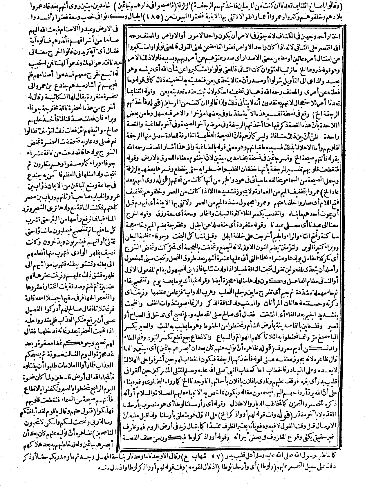 وافتخار بما كانوا فيه من القذارة كما يقول الشطار من الفسقة لبعض الصلحاء إذا وعظهم أبعدوا عنا هذا المتقشف، وأريحونا من هذا المتزهد. قوله: (من أمن به الخ) أي ليس المراد بالأهل الأقارب بل من اتبعه من المؤمنين كما صرح به في رواية أخرى، وقوله وأهلة وفي نسخة واغلة اسم امرأته، وقوله: (فإنها الخ) تعليل لعدم نجاتها. قوله: (من الذين بقوا في ديارهم فهلكوا الخ) هذا إحدى الروايتين لأنه روي أنه أخرجها معهم وأمر أن لا يلتفت أحد منهم إلا هي فالتفتت فأصابها
