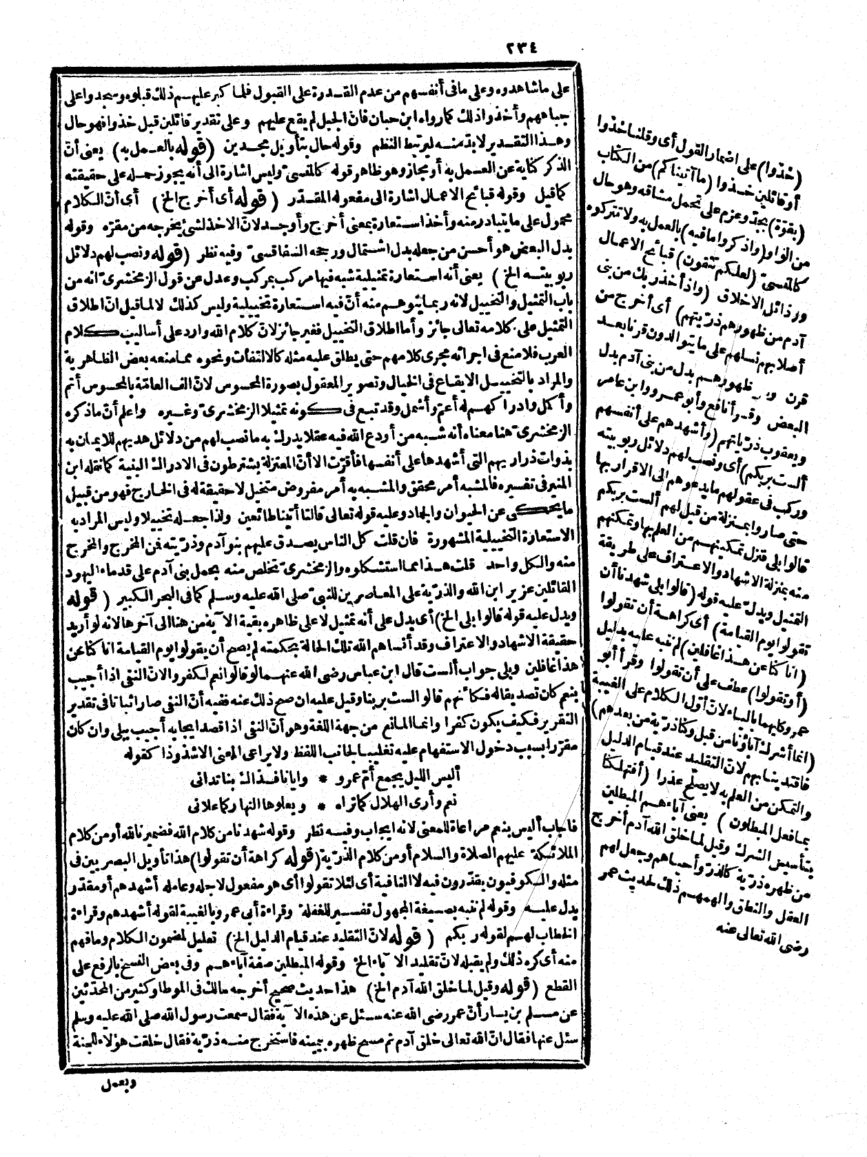 وبعمل أهل الجنة يعملون، ثم مسح ظهره فاستخرج منه ذرية فقال خلقت هؤلاء للنار، ويعمل أهل النار يعملون فقال ائرجل يا رسول الله ففيم العمل فقال إنّ الله إذا خلق العبد للجنة استعمله بعمل أهل الجنة حتى يموت على عمل من أعمال أهل الجنة فيدخله الله الجنة، وإذا خلق الله العبد للنار استعمله بعمل أهل النار حتى يموت على عمل من أعمال أهل النار فيدخله الله النار " (1 (وللمفسرين والمحدثين ومثايخ الصوفية هنا كلام طويل الذيل، والحديث ناطق بأنّ هذا معنى الآية لأنه ساقه مساق التفسير لها واطباق المعتزلة على أنّ القرآن لا يفسر بالحديث مخالف لإجماع من يعتد به، وكذا قول الإمام إنّ ظاهر الآية يدل على إخراج الذرّية من ظهر بني آدم