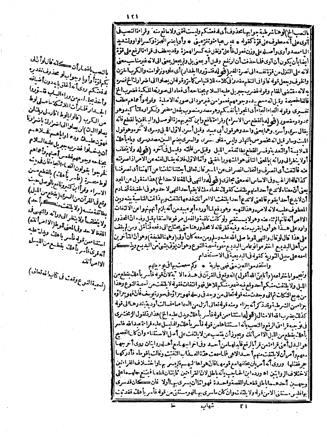 أنت سريت بها فإنه أهلك عن الالتفات غيرها فإنها ستلتفت فيصيبها ما أصاب قومها ضكانت قراءة النصب دالة على مجموع المعنى المراد، وارتضاه الشارح المدقق في الكشف، وتممه بدفع ما يرد على الكشاف من أنه يلزم من قوله واختلاف القراءتين لاختلاف الروايتين الشك في كلام لا ريب فيه من رب العالمين بأنّ معناه أنّ اختلاف القراءتين جالب، وسبب لاختلاف الروايتين كما تقول السلاج للغزو أي أداة وصالح، ونحوهما ولم يرد أنّ اختلاف القراءتين قد حصل، ولا شك أنّ كل رواية تناسب قراءة وهذا ما أمكنني في تصحيحه، وأورد عليه أنه مع بعده فيه أنه تنقلب حينئذ الرواية دراية لاتحادهما من ظاهر القراءة وأيضاً فيه التزام استلزام اختلاف الروايتين أمراً محذوراً هو الجمع بين متنافيين، وكلاهما غير وارد فتأمّل، وقال في المغني الذي أجزم به أنّ قراءة الأكثرين ليست مرجوحة، وأنّ الاستثناء على القراءتين من أسر بدليل قراءة ابن مسعود رضي الله عنه، وأن الاستثناء منقطع بدليل سقوط، ولا يلتفت في سورة الحجر والمراد بالأهل المؤمنون وان لم يكونوا من أهل بيته كما في قوله لنوج صلى الله عليه وسلم إنه ليس من أهلك ووجه الرفع أنه مبتدأ أو الجملة بعده خبره كقوله: {لَّسْتَ عَلَيْهِم بِمُصَيْطِرٍ إِلَّا مَن تَوَلَّى وَكَفَرَ} [سورة الغاشية، الآية: 23] إلا أنه جعل النصب على اللغة الحجازية والرفع على التميمية، ولم يجعل المستثنى جملة، وهو أولى ليكون الرفع على اللغتين لضعف اللغة التميمية والمعنى أسر بالمؤمنين لكن امرأتك مصيبها ما أصابهم، وهو وجه حسن وذهب الرضي إلى أنّ الاستثناء متصل ولا تناقض قال: لما تقرّر أن الاتباع هو الوجه مع الشرائط المذكورة ولما كان أكثر القرّار على النصب هنا تكلف الزمخشري له ما مرّ فاعترض عليه ابن الحاجب بما قرّرناه، والجواب أن الإسراء وان كان مطلقاً في الظاهر إلا أنه مقيد في المعنى بعدم الالتفات فمآله أسر بأهلك إسراء لا التفات فيه إلا امرأتك فإنك تسري بها إسراء مع الالتفات فاستثن على هذا إن شئت من أسر أو لا يلتفت، ولا تناقض، وهذا كما تقول امش ولا تتبختر أي امش مشيا لا تتبختر فيه فكأنه قيل ولا يلتفت منكم أحد في الإسراء وكذا امش ولا تتبختر في المشي فحذف الجاز والمجرور للعلم به، وقد ذكر مثله بعينه الفاضل اليمني، وفي شرح المغني أنه كثير إما يأخذ كلام الرضي بعبارته كما يعرفه من تتبع كلامه وقد أورد عليه السيد قدس سرّه في حواشيه أنّ الاستثناء إذا رجع إلى القيد كان المعنى فأسر بجميع أهلك إسراء لا التفات فيه إلا من امرأتك فيكون الإسراء بها داخلا في المأمور به وإذا رجع إلى المقيد لم يكن الإسراء داخلاً في المأمور به فيكون المحذور باقيا بحاله ولا دفع له إلا بأن تناول العامّ إياها ليس قطعياً لجواز أن يكون مخصوصا فلا يلزم من رجوع الاستثناء إلى قوله فلا يلتفت كونه مأمورأ بالإسراء بها، وحينئذ يوجه الاستثناء بما ذكر من أنها تبعتهم أو أسري بها مع كونه غير مأمور بذلك إذ لا يلزم من عدم الأمر به النهي عنه فتأمّل اهـ (وفيه بحث) لأنّ قوله وإذا رجع إلى المقيد الخ إن أراد به