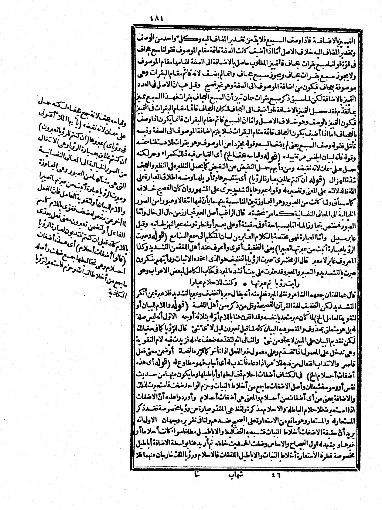 يضرّ ذكرهما كما إذا قلت رأيت أسد قريش فهو قرينة أو تجريد فقوله تخاليطها تفسير له بعد التخصيص وقوله فاستعيرت لذلك إشارة إلى التخاليط الثاني أنّ الأضغاث استعيرت للتخاليط الواقعة في الرؤيا الواحدة فهو أجزاؤها لا عينها فالمستعار منه حزم النبات، والمستعار له أجزاء الرؤيا فهذا كما إذا استعرت الورد للخدّ ثم قلت شممت ورد هند مثلاً فلا يقال إنه ذكر فيه الطرفان قال في الفرائد: أضغاث الأحلام مستعارة لما ذكر، وهي تخاليطها، وأباطيلها، وهي قد تحقق في رؤيا واحدة، وقد وقع للشراح، وأرباب الحواشي هنا أجوبة غير منتجة منها أنّ المراد بالاستعارة معناها اللغوي فلا يضرّ كونه من قبيل لجين الماء، وهو مع تعسفه: يردّه قوله في الأساس، ومن المجاز أضغاث أحلام، وهو ما التبس منها، وضغث الحديث خلطه لأنّ المتبادر منه المجاز المتعارف وإن كان يطلقه على غيره فيه، ومنها أنّ الأحلام وان تخصصت بالباطلة فالمراد بها هنا مطلق المنامات والمستعار له الأحلام الباطلة، وهي مخصوصة، والمذكور هنا المطلق وليس أحد طرفيها قال العلامة فإن قلت شرط الاستعارة أن لا يكون المشبه مذكورا، ولا في حكم المذكور، والتقدير كما ذكرت هي أضغاث أحلام فلا يكون استعارة قلت هذه والاستعارة ليست استعارة أضغاث الأحلام للمنامات بل استعارة الأضغاث لأباطيل المنامات، وتخاليطها، وهي غير مذكورة، والحلم بضم اللام، وسكونها والرؤيا بمعنى واحد، وهو ما يراه النائم في النوم هذا بحسب الأمر الأعمّ كما في أضغاث أحلام فإنّ المراد بها المنامات أعم من أن تكون باطلة أولا إذ الأضغاث هي الأباطيل مضافة إلى الأحلام بمعنى من، وقد تخصص! الرؤيا بالمنام الحق، والحلم بالمنام الباطل اهـ، وهذا وان سلم أنّ ذكر المشبه بأمر أعم لا ينافي الاستعارة لا تسلم صحته هنا لأنّ المبتدأ المقدّر رؤيا مخصوصة فقد وقع فيما فرّ منه على أنّ إضافة ة العام إلى الخاص لا تخلو من الكدر، إذ المعهود عكسها فإن أراد أنّ الضمير راجع إلى الرؤيا من غير اعتبار كونها مخلطة، وباطلة كما قالوه في نهاره صائم إذا جعلا مجازا من أنّ ذكر الطرفين مطلقاً لا ينافي الاستعارة بل إذا كان