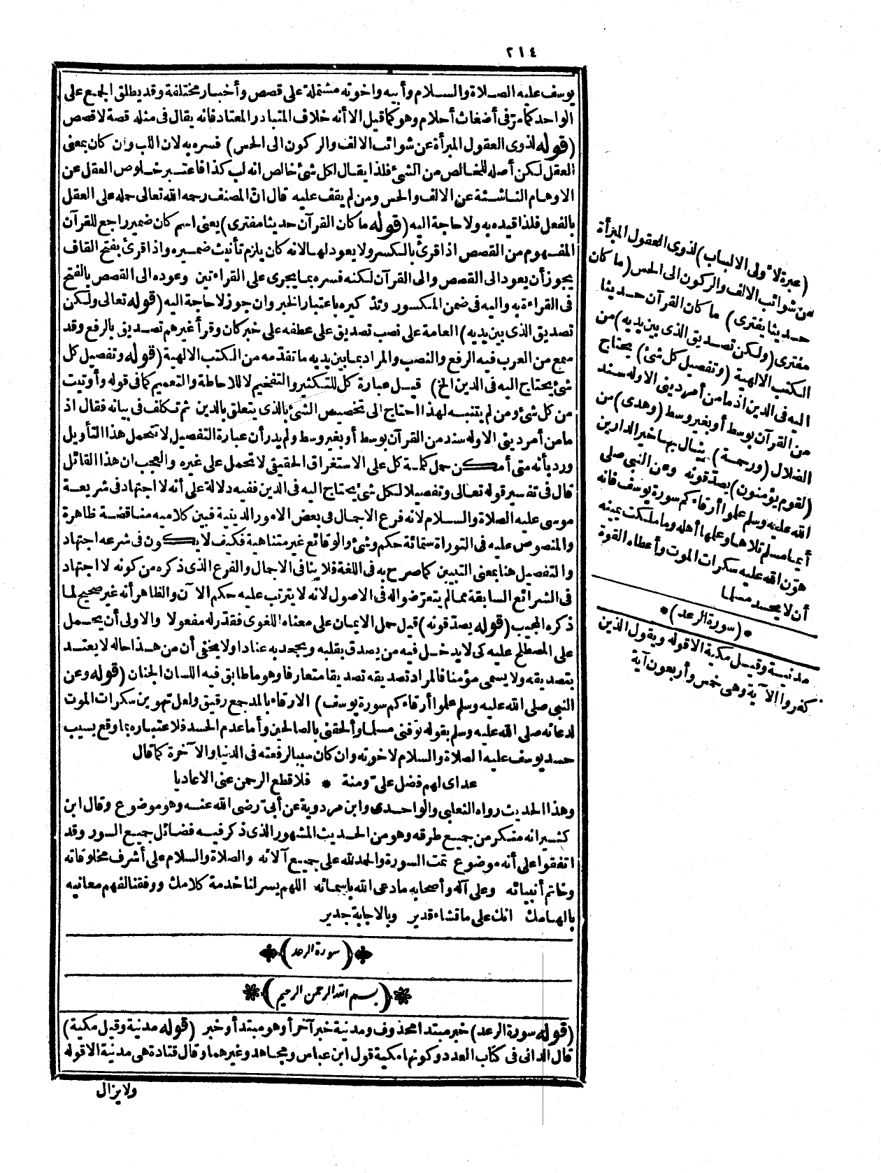 ولا يزال الذين كفروا تصيبهم بما صنعوا قارعة، وروي من أوّلها إلى آخر ولو أن قرأنا الآية نإنه مدنيّ وباقيها مكي، وهي ثلاث وأربعون في الكوفي، وأربع في المدني، والمكي وخمس في البصري، وسبع في الشامي. قوله: (قيل معناه أنا الله أعلم وأرى) هذا بناء على أنها حروف مقتطعة من كلمات، وهو أحد الأقوال السابقة، وتخصيصه هنا هذا الوجه لأنه مأثور روي عن مجاهد كما في الدرّ المنثور فما قيل من أنه لا وجه له لا وجه له. قوله: (يعني بالكتاب السورة الخ (ليس من باب إطلاق اسم الكل على البعض لأنّ الكتاب بمعنى المكتوب صادق على السورة فلا داعي إلى التجوّز من غير قرينة، والحامل على ذلك ما ستراه في تصحيح الحمل، وقوله وتلك إشارة إلى آياتها باعتبار أنها التلاوة بعضها والبعض الآخر في معرض! التلاوة صارت كالحاضرة أو لثبوتها في اللوج أو مع الملك، وهذا على جعل تلك مبتدأ، وآيات الكتاب خبره، وقيل إشارة إلى أنباء الرسل عليهم الصلاة والسلام المذكورة في آخر السورة المتقدمة، وأمّا إعراب المر فكما مز في البقرة. قوله:) اي تلك الآيات آيات السورة الكاملة (قيل في بيانه إن خبر المبتدأ إذا عرف بلام الجنس أفاد المبالغة وأنّ هذا المحكوم عليه اكتسب من الفضيلة ما يوجب جعله نفس الجنس، وإنه ليس نوعاً من أنواعه وهو في الظاهر كالممتنع، ولذا قال الزمخشري: الكاملة العجيبة في بابها فيحمل على الاستغراق لمقتضى المقام مبالغة في الكمال إذا أريد بكل كتاب السورة أو على الحقيقة فيدعي اتحاد مفهوم الكتاب بالسورة، ولذا قيل الكتاب دون السورة، وقيل الكمال مستفاد من إطلاق الكتاب الذي هو مجموع المنزل على بعضه فكأنه الكل في الكمال كأنه المستأهل لأن يسمى كتاباً دون غيره، وليس هذا من قبيل قوله تعالى ذلك الكتاب المفيد لحصر جن! الكتاب في المشار إليه فيفيد أنه الكامل دون ما عداه من الكتب إذ المسند هنا ليس معرّفا باللام حتى يفيد حصره في المسند إليه بل المضاف إلى المعرف، وقيل إنّ الكمال مستفاد من حمل اللام على الاستغراق أو الحقيقة للمبالغة في الكمال لا لأنّ مدخول اللام ليس بمسند فإن مدار الإفادة هو