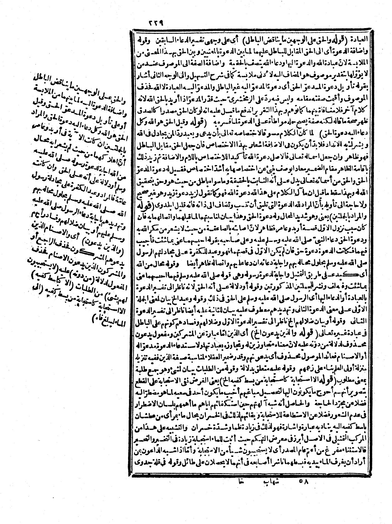 دعائ! أراد عدم الجدوى لكه بالغ بذكر القلة، وارادة العدم دلالة على تحقيق الحق، وايثار الصدق لإشمام طرف من التهكم فهو من تشبيه المفرد المقيد كقولك لمن لا يحصل من سعيه على شيء كالراقم على الماء فإنّ المشبه هو الساعي مقيداً بكون سعيه كذلك، والمشبه به هو الراقم مقيداً بكونه على الماء، وكذلك فيما نحن فيه، وليس من المركب العقلي في شيء على ما توهم نعم وجه الشبه عقلي اعتباري، والاستثناء مفرغ من أعم عام الأحوال أي لا تستجيب الآلهة لهؤلاء الكفرة الداعين إلا مشبهين، أعني الداعين بمن بسط كفيه ولم يقبضهما،
