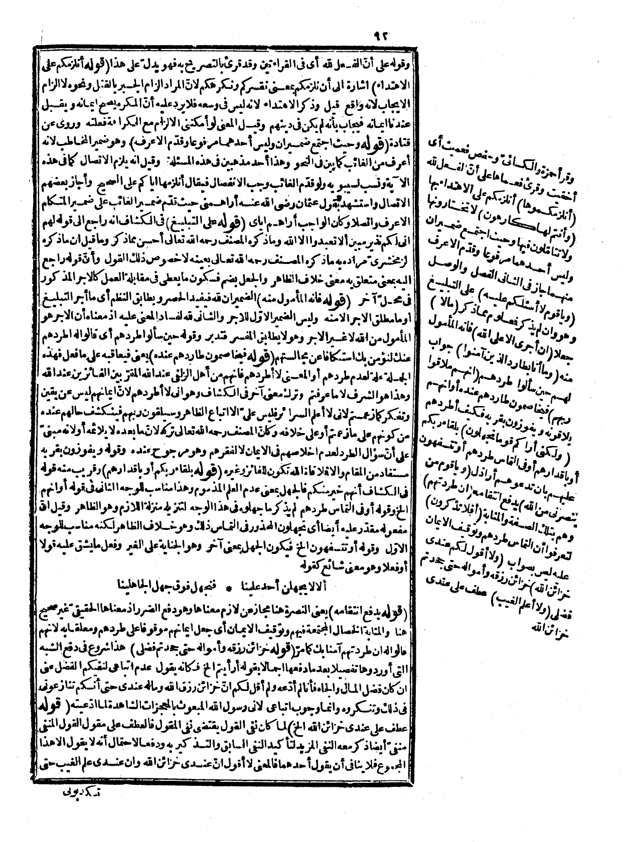 النبوّة والإنذار بالعذاب، فإنه بإعلام الله ووحيه، والغيب ما لم يوج به، ولم يقم عليه دليل، وليس هذا كذلك، وقيل: إنه غير ملائم للمقام، والظاهر أنه صلى الله عليه وسلم حين اذعى النبوّة سألوه عن المغيبات وقالوا له: إن كنت صادقا فأخبرنا عنها فقال: أنا أذعي النبوّة بآية من ربي، ولا أعلم الغيب إلا بإعلامه، ولا يلزم أن يذكر ذلك في النظم، كما أنّ سؤال طردهم كذلك، ولا يخفى عليك أنه لا قرينة تدلّ على ما ذكره، وأمّا طردهم فإن استحقارهم لهم قرينة على ذلك، وقد صرّح به السلف رحمهم الله، ومثله لا يقال من قبل الرأي. قوله: (أو حتى أعلا أنّ هؤلاء أنبعوكي بادىء الرأي من غير بصيرة ولا عقد قلب) قيل: ظاهر. أنّ المراد أنهم آمنوا نفاقاً فعلى هذا يكون المراد من قولهم بادي الرأي بادي رأي من يراهم، وليم يذكر هذا الاحتمال، ويجوز أن يكون المراد عقداً جازما ثابتا كأنّ ما سواه ليس بعقد، وردّ بأن المراد بالبصيرة وعقد القلب اليقين، والاعتقاد الجازم، وهو شامل للوجهين في بادىء الرأي لا مغاير لهما، كما توهمه هذا القائل، ولا يخفى أنّ هذا صيد من المقلي، فإنه الوجه الثاني الذي ذكره بقوله ويجوز الخ وما ذكر. أوّلاً بناء على الظاهر من عقد القلب، فإنّ ربط القلب بالشيء اعتقاد له، وعدمه هو النفاق، ولا شك أنه لم يسبق له ذكر. قوله: (وعلى الثاني يجوز عطفه على أقول) كما يجوز عطفه على المقول، وأمّا على التفسير الأوّل فيتعين الثاني، وفيه نظر. قوله: (حتى تقولوا ما أنت إلا بشر مثلنا الا يخفى أنّ هذا مبنيّ على الوجه الثاني المذكور في الكشاف في تفسير قوله: {مَا نَرَاكَ إِلاَّ بَشَرًا مِّثْلَنَا} [سورة هود، الآية: 27] وقد مرّ أنّ المصنف رحمه الله تعالى لم يعرّج عليه، ولم يرتضه لابتنائه على الاعتزال، ومنه تعلم ما في الكشف من النزاع في الابتناء، فإنه إنما فسره به لاقتضاء النظم له وتوصيفه هنا بالبشرية صريح فيه، إلا أن يقال قوله سابقا لا مزية لك علينا، شامل للوجهين، فإنّ المزية المقتضية لوجوب طاعته، بأن يحوز كمالات جنسهم، أو بأن يكون من جنس آخر أفضل منهم، ولا مانع من ذلك في كلامه، فهذا يعين إرادته فيما مر، وأما جعل هذا كلاما آخر وليس ردّا لما قالو. سابقاً فلا وجه له. قوله: (في شأن من استرذلتموهأ) إشارة إلى أن اللام ليست للتبليغ بل للأجل، والا لقيل لن يؤتيكم، وأن الإسناد للأعين مجاز كما سيأتي، وأنّ العائد محذوف، وأنّ الازدراء وقع، والتعبير بالمضارع للاستمرار أو لحكاية الحال، وقوله: فإن ما أعد الله الخ ولا يبعد أن يراد به خير الدنيا والآخرة، إذ المال غاد ورائح، وقد أورثهم الله أرضهم وديارهم بعد غرة! م، وقوله: إن قلت تفسير لإذا لأنها جواب وجزاء كما مرّ، وقوله: لتجانس الراء في الجهر فإن التاء مهموسة.