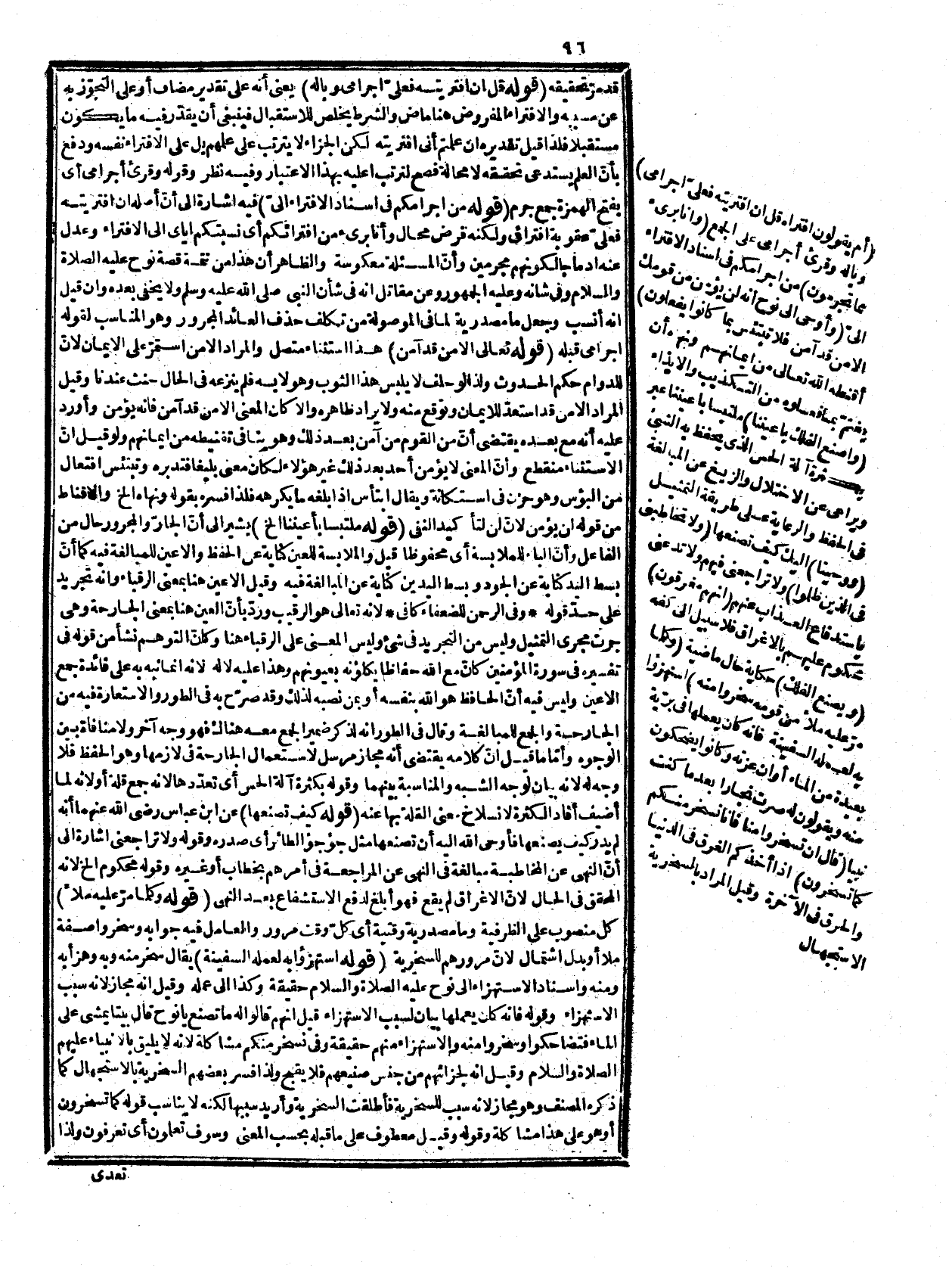 ( {حَتَّى إِذَا جَاء أَمْرُنَا} ) هو واحد الأوامر، أي الأمر بركوب السفينة، أو واحد الأمور وهو الشأن، وهو نزول العذاب بهم، وقلنا على الاحتمال الأوّل استئناف، وعلى الثاني جواب إذا. قوله: (نبع الماء منه وارتفع كالقدر الخ) إشارة إيى أنه استعارة، شبه خروج الماء بفوران القدر، مع ما في إخراج الماء من التنور الذي هو محل النار من الغرابة، والتنور كالفرن ما يوقد فيه النار للخبز، وهو معروف قيل إنه كان تنورا لآدم يخبز فيه، وهو من حجارة وكان عنده، وقيل: غير ذلك كما ذكره المصنف رحمه الله تعالى، واختلف فيه وفي ماذته، فقيل: إنه عربيئ ووزنه تفعول من النور، وأصله تنوور، فقلبت الواو الأولى همزة لانضمامها، ثم حذفت تخفيفا، ثم شددت النون عوضا عما حذف، وهذا القول نقل عن ثعلمب، وقال أبو علي الفارسيّ وزنه فعول، وقيل: على هذا إنه أعجمي ولا اشتقاق له، ومادّته تنر، وليس في كلام العرب نون قبل راء، ونرجس معرب أيضا، والمشهور أنه مما اتفق فيه لغة العرب والعجم كالصابون، وقوله: في موضع مسجدها على يمين الداخلي مما يلي باب كندة، ذكره في سورة المؤمنين، وقوله: بعين وردة بمنع الصرف لأنه علم لها، وقوله: من أرض الجزيرة، يعني الجزيرة العمرية، وسيأتي في المؤمنين إنه بالشأم، فحمل على اختلاف الرواية، وقوله: أشرف أي أعلى من الشرف، وهو مرتفع الأرض، وقوله: في السفينة يشير إلى أنه أنث ضمير الفلك لأنه بمعنى السفينة. قوله: (من كل نوع الخ) يشير إلى أنّ التنوين عوض عن المضاف، أو هو بيان للمعنى المراد، وفي الكشاف ما يقتضي أنه حمل الوحوس والهوام وغيرها، وقراءة العافة ب ضمافة كل لزوجين، وقرأها حفص بالتنوين، فعلى الأوّل اثنين مفعول احمل، ومن كل زوجين حال، وقيل من زائدة واثنين نعت مؤكد لزوجين بناء على جواز زيادتها في الموجب، وعلى قراءة حفص زوجين مفعول، واثنين نعت مؤكد له، ومن كل حال أو متعلق باحمل، وقوله ذكرا وأنثى تفسير لزوجين، والزوج هنا احمواحد المزدوج بآخر من جنسه، لا مجموع الذكر والأنثى، والا لزم أن يحمل من كل ص كف أربعة أصناف، وهو أحد معنييه كما بيناه في شرح الدرّة، وزوجين على الأوّل بمعنى ؤهـ ت بت، وعلى الثاني بمعنى صنفين، وقوله عطف على زوجين اي على القراءة الأولى: وعلى اثت 3يئ على الأخرى. قوله:) والمراد امرأته! أي المسلمة