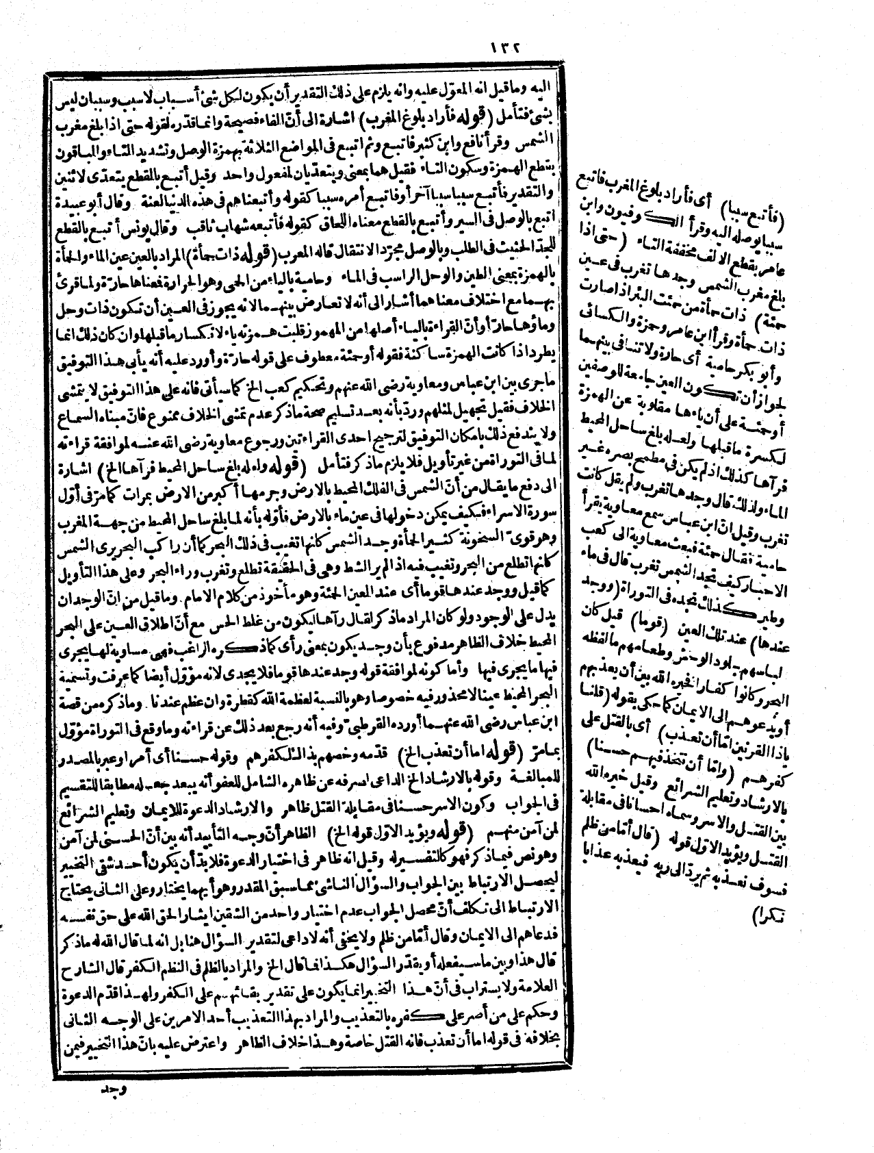 الأنبياء عليهم الصلاة والسلام والهاماتهم وحي أيضا كما بين في محله والكلام هنا على تقدير عدم نبوّته عليه الصلاة والسلام ولا احتمال للتوزيع كما توهم، وقوله يسرا صفه مصدر محذوف أي قولاً بتأويله بصفة أو بتقدير مضاف، وقوله: يوصله إلى المشرق القرينة على إرادة هذا قوله: بلغ مطلع الشمس. قوله: (يعني الموضع) أي على قراءة الكسر اسم مكان وعلى قراءة الفتح مصدر ميمي لكنه بتقدير مضاف لتتفق القراءتان، ولأنّ البلوغ للمكان ولم يلتفت إلى ما ذكره أهل الصرف من أنه اسم مكان إفا لأنه لم يرد في كلام الفصحاء بالفتح إلا مصدرا فلا حاجة إلى تخريج القرآن على الشاذ لأنه يخل بالفصاحة أو لأنه لا دليل لهم عليه لأنّ ما ورد منه بمعنى المكان بتقدير المضاف كما هنا، فلا وجه لما قيل إنّ الجوهرفي قال إنه اسم مكان أيضا فلا حاجة إلى تقدير المضاف. قوله: (تطلع الشمس عليه أولاً من معمورة الأرض (قيل عليه إنه بيان للواقع والا فلا فائدة في ذكره وليس بشيء لأنّ السماء كرية وكل أفق مطلع للشمس ولكل أرض مطلع فلو لم يفسره بما ذكره لم يدلّ على أنه بلغ غاية الأرض المعمورة وهو المراد. قوله: (من اللباس) فالمراد به المتعارف، أو البناء فالمراد به مطلق الساتر، وكونها لا تمسك الأبنية لرخاوتها، فإن قيل إذا كانت كذلك كيف يكون فيها الإسراب جمع سرب بفتحتين وهو الحجر والحفيرة، قلت: لا مانع منه كما توهم فرب أرض لا تحمل البناء لثقله ويحفر فيها حفر تمكث زمانا كما نثاهده في مواضع كثيرة، وقيل: إنه لا جبال فيها فهي كثيرة