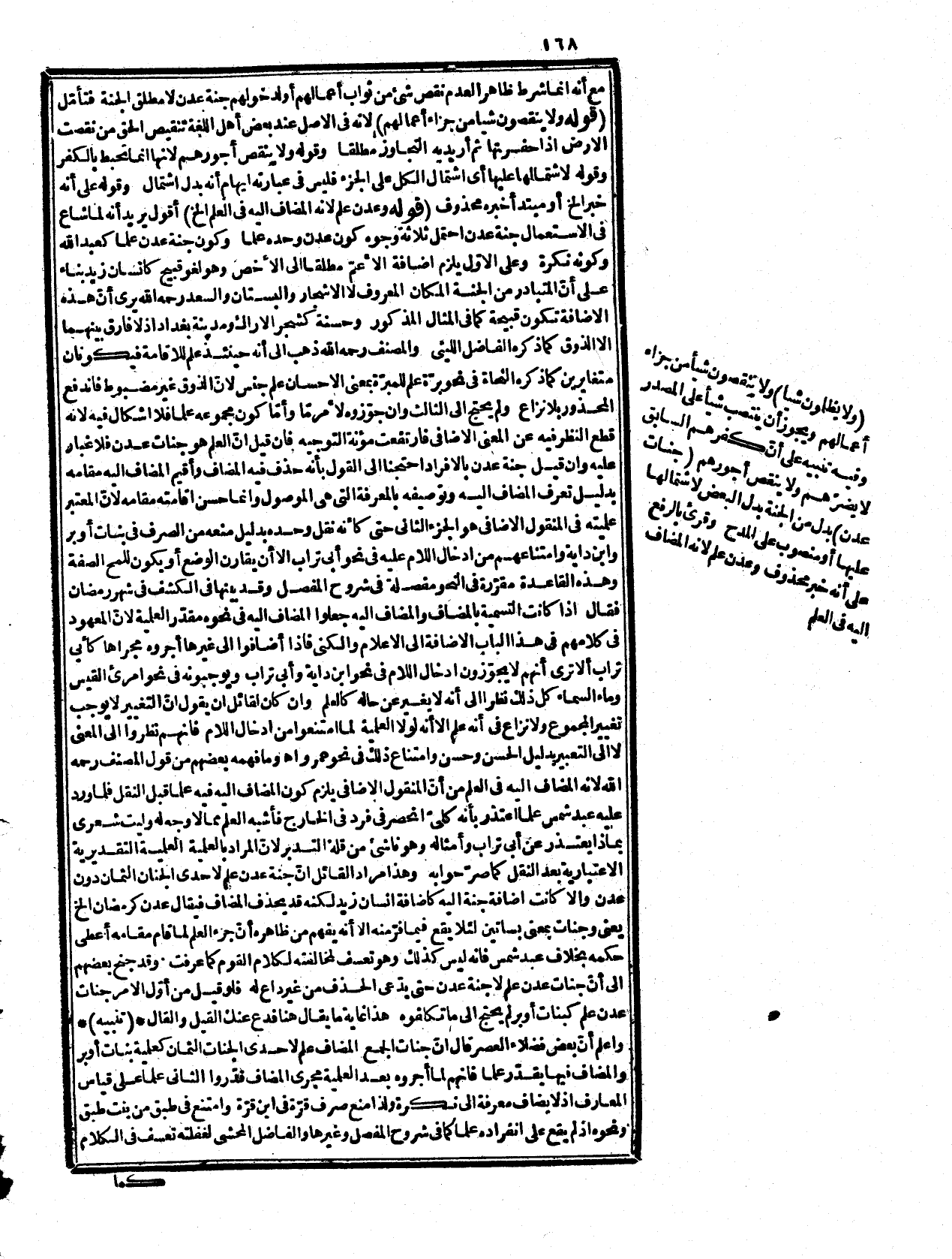 كما رأيت فقال: جنة عدن علم لإحدى الجنان دون عدن دمالا كان كإنسان زيد كما قيل لكنه قد يحذف المضاف ويقام المجموع فيستعمل استعمال الإعلام كما في رمضان وكذا عدن والمعنى جنات جنة عدن فلا يتوجه النقض بمثل عبد شمس، ولا يحتاج إلى الجواب بأق الشمس لانحصارها في فرد بمنزلة العلم اص. ولا يخفى أنه على ما ذكرنا الكلام على ظاهره وليس إضافة جنة إلى عدن كإضافة إنسان زيد ولا نقض بمثل عبد شمس لأن لفظ شمس فيه يقدر علما دران لم يستعمل على انفراده علما، ولا حاجة إلى الجواب بما ذكر فتأمل وتدبر. قوله: (أو علم للعدن بمعنى الإقامة (يعني أنه علم جنس للمعاني مفرد وفيما قبله هو علم شخص للذات ومركب وهذا ما اختاره في الكشاف من أنه علم لمعنى العدن بسكون الدال بمعنى الإقامة كسحر وأمس وفينة وكأنه لما رأى المضاف فيه يجمع ويفرد ويوصف ذهب إلى هذا والمصنف لما رأى الإضافة فيها نوع ركاكة خالفه! ان ما ذكر يقتضي بناءه كما بين في النحو كما مر، وقوله: للعدن يعني أن المجرد من اللام علم للمعزف بها، كسحر علم للسحر وأ!! للأمس وبرة بفتح الباء رمنع الصرف علم للبز والإحسان، وقوله: رلذلك الخ دليل لعلمية عدن لكنه بناء على الظاهر لعدم تعينه إذ لا نسلم العلمية بل نقول هو بدل ولم يذكر ما