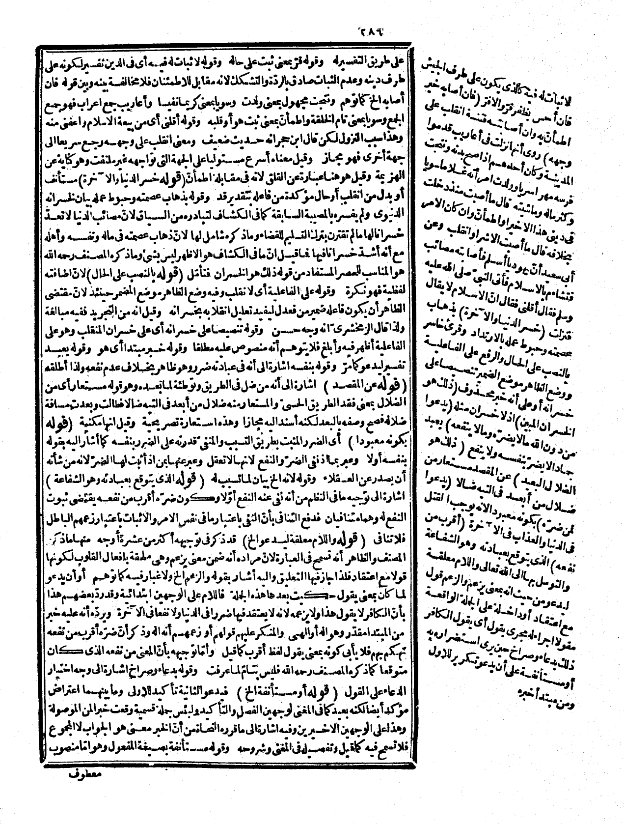 معطوف على مقولاً أو هو مرفوع خبر مبتدا محذوف أي أو هي جملة مستأنفة، وأمّا عطفه على معلقة وكونه بصيغة الفاعل على الإسناد المجازي فتكلف بارد. قوله: (من إثابته الموحد الخ) ما ذكره معنى الآية بقرينة ذكر هؤلاء واثابتهم بعد ذكر المشركين وخسرانهم. قوله: (كلام فيه اختصار (وايجاز حذف لأنّ المجادلة والكلام معه وهو كعلم لا يخفى. وإذا فسر الرزق بمعنى النصر من قولهم: أرض! منصورة بمعنى مستقية ممطورة فالمعنى من كان يظن إنه لم يرزق والغرض الحث على الرضا بما قسم الله لا كمن يعبد الله على حرف وهو تحذير المؤمنين عن حال هؤلاء والضمير على الأوّل للرسولءش! وعلى هذا لمن ومرضه لبعده وعدم ملايمته لما بعده. وقوله: من غيظه بقرينة ما بعده لأنّ الاحتيال في ذهاب الغيظ يقتضي سبقه ففيه إيجاز أيضا. قوله: (فليستقص) أي يبالغ لأن المبالغ في أمر يبلغ أقصاه، والجزع التضجر وعدم الصبر وازالة الغيظ على المعنى الأوّل للنصر والجزع على الثاني. والممتلئ غضبا بمعنى الشديد غضبه فهو استعارة وجزعا تمييز. وقوله: سماء بيته أي سقفه والسماء ما ارتفع. وقوله: فيختنق هو تفسير ابن عباس رضي الله عنهما لقوله: يقطع ومفعوله محذوف أي نفسه بفتحتين أو أجله كما قدره الراغب ثم إنه ترك نسيا منسياً فصار بمعنى اختنق لازم خنقه وهو أي قطع النفس كناية عن الاختناق. قوله: (إلى سماء الدنيا (فالسماء بمعناها المعروف والقطع بمعنى قطع المسافة سيرا أو صعوداً وعنانه بفتح العين على المشهور وهو المصزج به في الصحاح قال كأنه جمع عنن في الأصل وهو وجه السماء وطرفها والكسر فيه عاقي. وقال: في القاموس إنه بالكسر وفي المصباج عنان كسحاب لفظا ومعنى واحد. عنانة وضمير عنانه للسماء ذكره لتأويله بما علا. قوله: (في دفع نصره الف ونشر على تفسيري النصر. وقوله: بكسر اللام أي لام الأمر وتسكن وبه قرأ غير هؤلاء، وقوله: فليتصوّر في نفسه أي فليتأمّل وأوّله لأنه بعد الاختناق لا يتصوّر منه النظر فيكون هذا