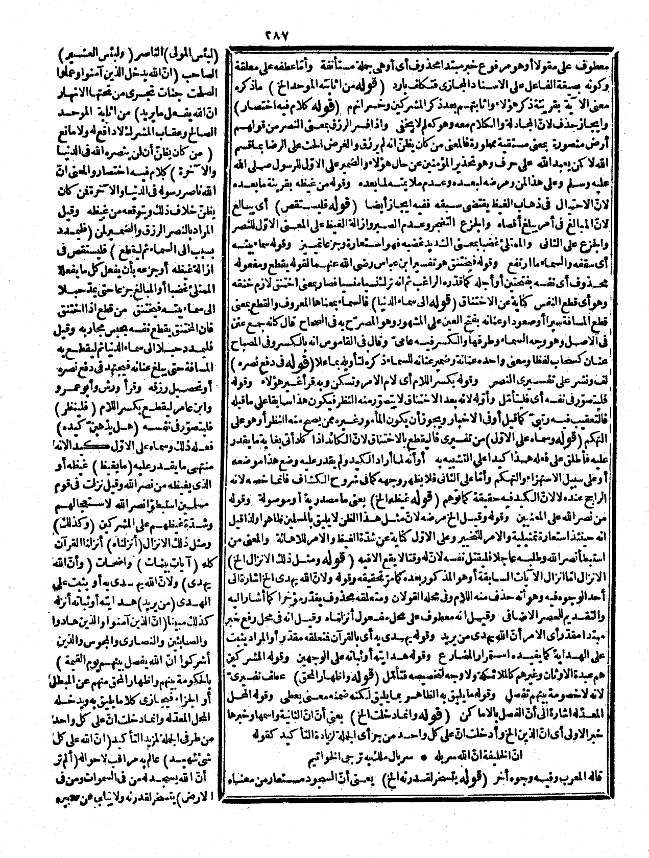 الجن مع اندراجه تحت عموم من فكلام واه لأنه كيف يتأتى التنويه وقد قرن به غير العقلاء كالدواب وأمّا التخصيص المذكور فلا قرينة عليه، وكون الجن غير مكلفين خلاف القول الأصح. قوله: (دل عليه خبر) وهو إشارة إلى كثرة الفريقين فلا يتوهم أنه كان ينبغي مقابلته بالقليل. وقوله: سجود طاعة يعني أنّ السجود المقدر غير السجود المذكور فإن قلت هذا يخالف ما في المغني من أن شرط الدليل اللفظي على المحذوف أن يكون طبقه لفظاً ومعنى أو معنى لا لفظاً فقط فلا يجوز زيد ضارب وعمرو على أنّ خبر الثاني محذوف وهو ضارب من الضرب في الأرض! أي مسافر والمذكور بمعناه المعروف وهو الإيلام قلت: هذا غير مسلم لما ذكره النحاة من أنّ المقدر يكون لازما للمذكور نحو زيداً ضربت غلامه، أي أهنت زيداً ولا يكون مشتركا لمثال المذكور إلا أن يكون بينهما ملائمة فيصح إذا اتحدا لفظا وكان من المشترك وبينهما ملازمة تدل على المقدر، ولذا لم يصح المثال المذكور. قوله: (بكفره وآبائه) قدره لدلالة ما قبله عليه. وقوله تكريراً للأوّل لا يخفى ما فيه لأنه إن جعل التكبير للتأكيد مع العاطف وحق خبر الأوّل كما قيل فهو ركيك وان جعل تكريراً لفظا لا معنى كان المراد بالثاني غير المراد بالأوّل ولذا دلّ على كثرة المحقوقين كما قيل فلا تكرار فيه لأنه كقولك أو من قوم وقوم، ويدفع بأن التكرير بحسب اللفظ وهو قد يفيد التكثير والمبالغة كقولك عندي ألف وألف أي ألوف كثير قال: