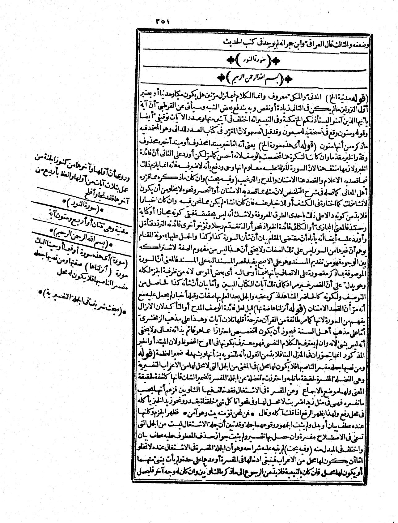 لم يشترط فيه ذكر مثله بعده وذكر ابن هشام في الباب الخامس من المغني أنّ شرط الحذف أن لا يؤذي إلى اختصار المختصر فلا يحذف اسم الفعل وما نقل عن سيبويه رحمه الله من حذفه تفسير معنى لا تقدير إعراب ومراده تقدير حذف الزم ونحوه. قوله: (وفرضنا ما فيها من الأحكام) يحتمل أن يريد أن المفروض أحكامها وهي مشتملة على غير الأحكام فأسند إلى الكل ما هو لجزئه كبني تميم قتلوا فلانا والقاتل أحدهم أو المفروض مدلولها لا هي فأسند ما لأحدهما للأخر لملابسة بينهما تشبه الظرفية أو هو على تقدير مضاف كما سأل القرية وقيل إنه مجاز في المفرد بعلاقة الحلول وهو بعيد لأنه إن تجوّز في السورة فالتوصيف بأنزلنا لا يناسبه وان كان في ضميرها على الاستخدام فهو خلاف الظاهر وفيما ذكر براعة استهلال. قوله: (وشدّده ابن كثير الخ) يعني أن التضعيف للتكثير في الحدث كطوّقت أو في المفعول ولو بواسط كما هنا فإنه لتكثير المفروض عليهم والمبالغة بزيادة الكيفية بشدة