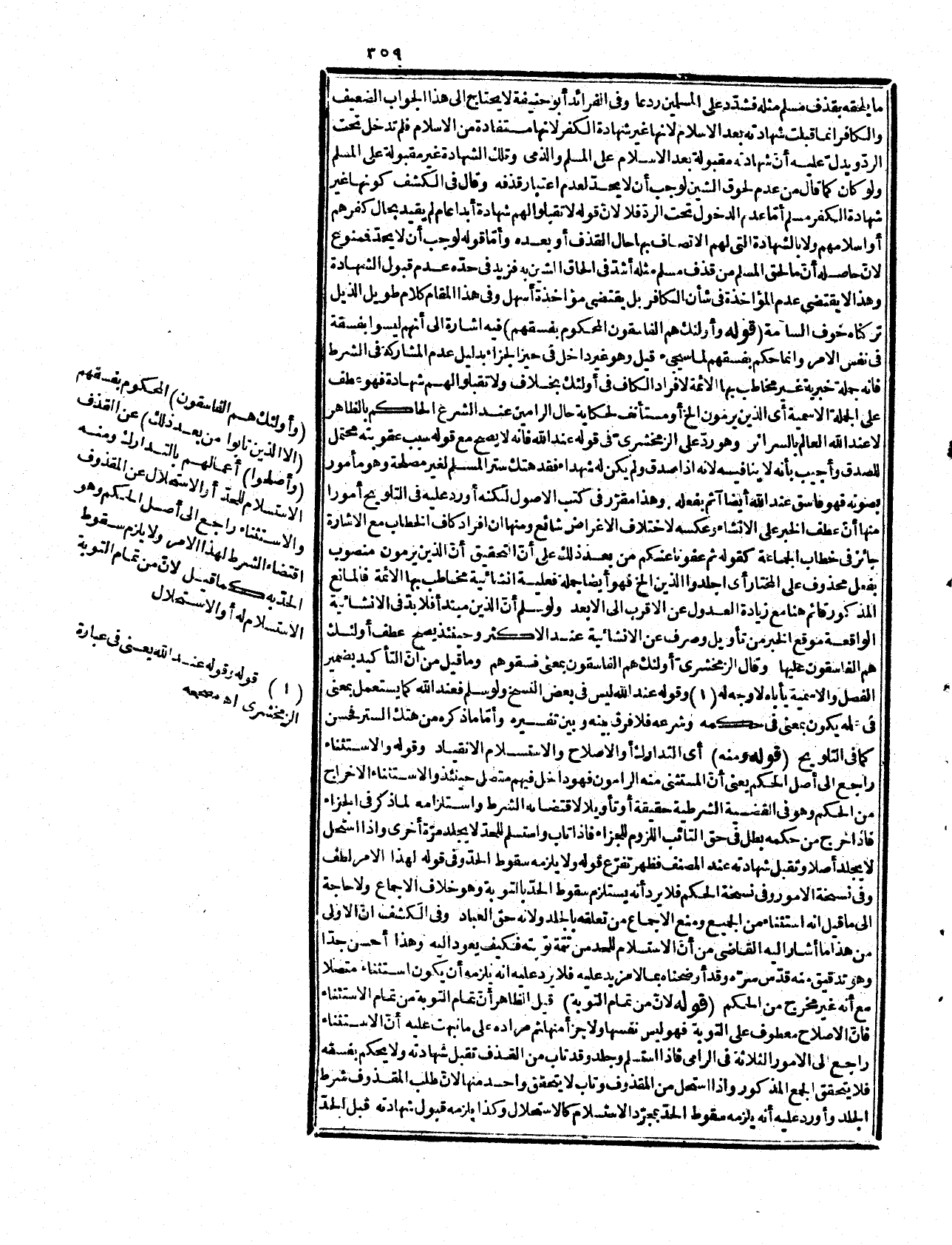 هذه المسألة وأمّا النحاة فقل من تعرّض لها منهم والذي ذكره ابن مالك في التسهيل أنّ الظاهر في المفردات عوده إلى الجميع ما لم يمنع مانع أو يظهر مرجح وأمّا الجمل فإن اتحل! معمولها فكذلك هالا فلا يجوز وفي شرح اللمع أنه يختص بالأخيرة وأنّ تعليقه بالجميع خطأ للزوم تعدد العامل في معمول واحد إلا على القول بأن العامل إلا أو تمام الكلام قبله ومنه يعلم ما في قوله الأصوليين أنه يجوز الجميع بلا خلاف وإنما الخلاف في الأظهر لأنّ الخلاف فيه مبنيّ على عامل الاستثناء فالظاهر أنّ الخلاف في صحته إلا ان يقال نظر الأصولي غير نظر النحوي أو أنه يقدر معمولاً لأحدها وبقدر مثله للآخر وكذا إذا اقتضى الاستثناء الإتباع وتعدّد إعراب المستثنى منه وما نقل عن البحر أنّ ابن مالك رحمه الله استثنى من ذلك ما إذا اختلف العامل والمعمول كقولك إكس الفقراء وأطعم أبناء السبيل إلا من كان مبتدعاً ففي هذه المسألة يعود إلى الأخير خاصة فتحصل منه أنّ ما قاله أبو حنيفة رحمه الله مختار أهل العربية فيه نظر فتأمّله فإنه كلام غير محزر. قوله:) وقيل منقطع الخ) اختلف في الاستثناء في هذه الآية هل هو متصل لأنّ المستثنى منه في الحقيقة الذين يرمون والتائبون من جملتهم لكنهم مخرجون من الحكم وهذا شأن المتصل كما تقول قام القوم إلا زيداً فزيد داخل في القوم غير متصف بالقيام وجعله فخر الإسلام ومن تبعه منقطعاً لأنه لم يقصد إخراجه من الحكم السابق بل إثبات حكم آخر له وهو أنّ التائب لا يبقى فاسقا ولأنه غير داخل في صدر الكلام لأنه غير فاسق وفيه تفصيل في الأصول هالى دليل فخر الإسلام أشار المصنف بقوله متصل بما بعده مع ما بين قوله المنقطع والمتصل من الطباق البديعي. قوله: (علة للاستثناء (أي لما تضمنه الاستثناء من التوبة وكأنه إشارة إلى ردّ ما في الكشاف من أنّ الاستثناء من الفاسقين لا من غيره لأنه لا يناسبه قوله فإنّ الله غفور رحيم بأنه ختم به تعليلاللاستثناء مع قطع النظر عن المستثنى منه مع أنه قال بعد هذا وظاهرها أن تكون الجمل الثلاث بمجموعها جراء الشرط كأنه قيل من قذف المحصنات فاجلوهم وردّوا شهادتهم وفسقوهم أي فاجمعوا لهم الجلد والردّ والتفسيق إلا الذين تابوا عن القذف وأصلحوا فإنّ الله يغفر لهم فينقلبون غير مجلودين ولا مردودين ولا مفسقين وهو يقتضي أنّ الأوّل غير مرضى له. وأجاب الطيبي بأنّ العذاب إمّا بالإيلام وامّا بالتذليل فإذا تاب وقبلت توبته رفع الله عنه العذاب بنوعيه فيناسب الختام والمبدأ. قوله: (نزلت في هلال الخ (تمام الحديث أنه