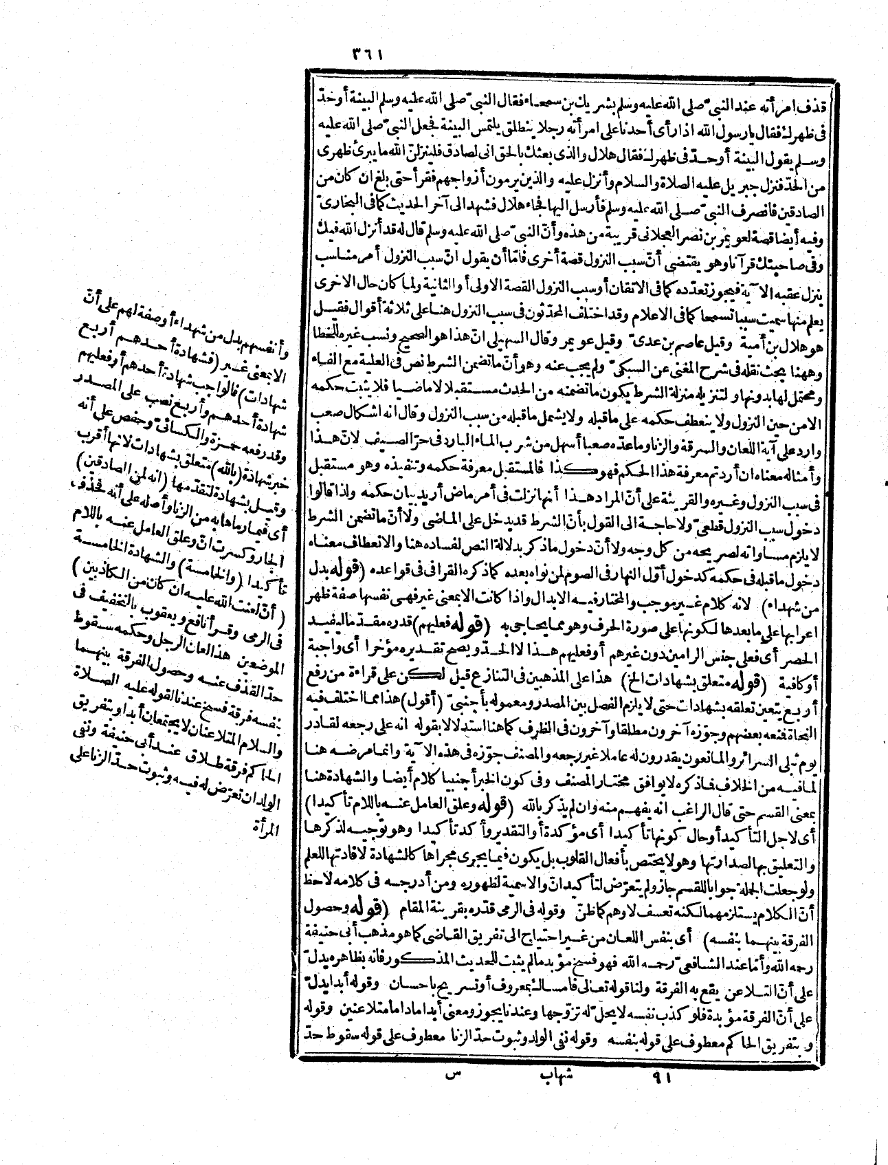 يمنع منه مانع لأنّ اللعان قائم مقام الحد عند. وقوله بالعطف على أن تشهد وأن غضب الله بدل منه أو خبر مبتدأ مقدّر. قوله: (متروك الجواب للتعظيم) أي ليدلّ على أنّ المقدر أمر هائل عظيم لا تحيط به العبارة وأنّ الله مصدر تأويلا معطوف على فضل وقوله من الأفك بفتح الهمزة وسكون الفاء مصدر أفك الرجل يأفك إذا كذب أو مصدر أفكته عن الأمر إذا صرفته عنه قاله البطليوسي وبكسرها مع سكون الفاء وجاء فتحهما أيضا بمعنى الكذب أو أبلغه كما في شرح البخاريّ للكرماني وقوله بأبلغ ما يكون من الكذب إشارة إلى أنّ اللام للعهد ويجوز حمله على الجنس قيل فيفيد القصر كأنه لا أفك إلا هو وقوله في بعض الغزوات وهي غزوة بني المصطلق قال ابن إسحاق وذلك سنة ست وقال موسى بن عقبة سنة أربع. قوله: (فإذن ليلة في القفول) آذن بالمد وتخفيف الذال المعجمة المفتوحة من الإيذان وهو الإعلام أو بالقصر وكسر الذال المخففة من الإذن أو بالفتح والقصر وتشديد الذال من التأذين بمعنى الإعلام أيضا والرحيل بالجرّ ويجوز نصبه على الحكاية كما في شرح البخاري والقفول بقاف وفاء بمعنى الرجوع متعلق بإذن وكذا بالرحيل يعني أنه كان في رجوعهم من الغزو وكون في القفول صفة ليلة بتقدير في أزمان القفول تكلف وجزع بفتح الجيم وسكون الزاي المعجمة خرزيمان وفي بعض الحواشي ويجوز كسرها وظفار بفتح الظاء المعجمة وكسر الراء بلا تنوين مبنيّ على الكسر قرية باليمن وروي في البخاريّ أظفار جمع ظفر وهو ما اطمأنّ من الأرض أو شيء كالخرز ويرحلها بضم الياء التحتية وتشديد الحاء المهملة أي يشد رحلها والهودج مركب معروف والمطية الناقة والجمل ومنشد بمعنى من يوصلها إلى القوم ويتفقدها من أنشدت الضالة إذا عرّفتها ونشدتها طلبتها فشبه من يوصلها بالمعرّف وهي باللقطة فلا وجه لما قيل إن الظاهر ناشد وصفوان بن المعطل بضم الميم وتشديد الطاء المكسورة السلمي بضم السين وفتح اللام علم لابن خالة لأبي بكر رضي الله عنه كان صاحب ساقة الجيش ثمة والتعريس بالسين المهملة النزول آخر الليل واذلج بتشديد الدال بمعنى لكر وأدلح بالسكون بمعنى سار الليل كله. قوله:) وهي من