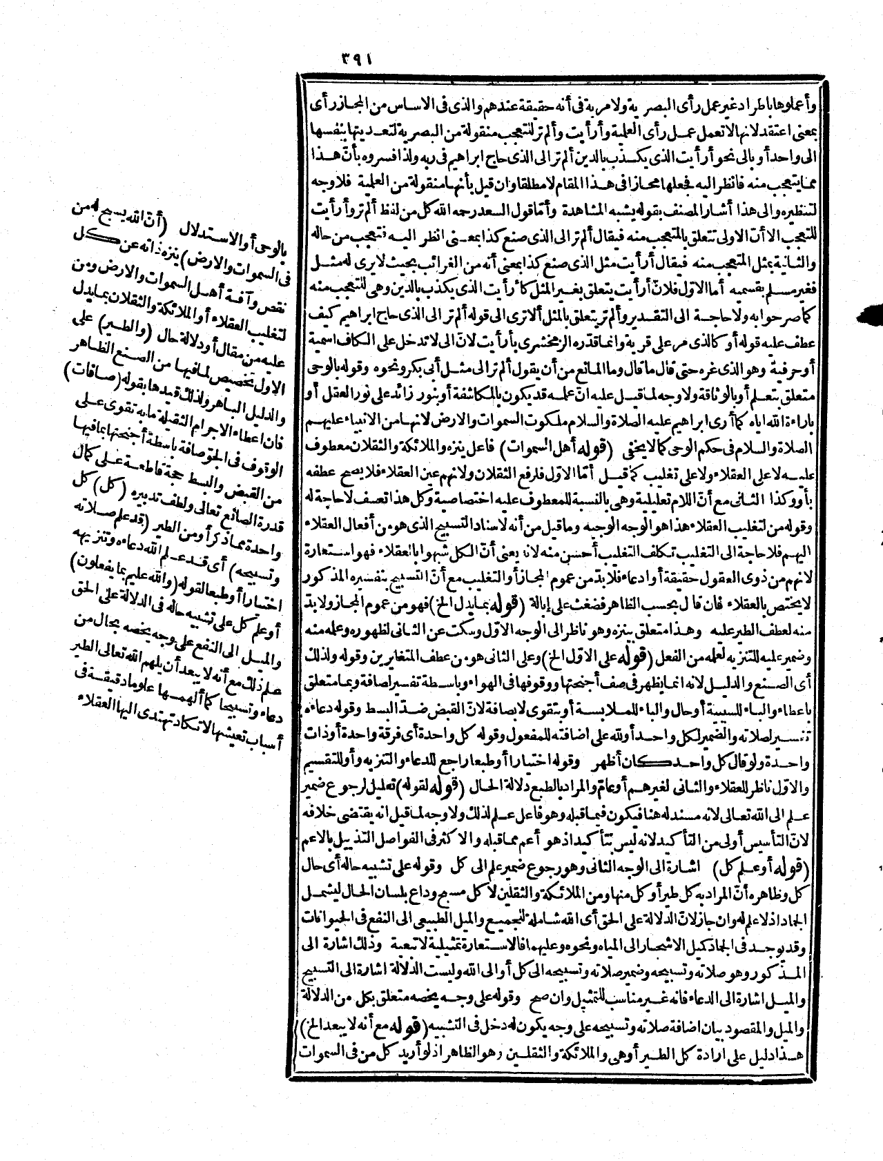والأرض كان قاصرا مع أنه قيل إنّ فيه جمعا بين المجاز والحقيقة والمصنف رحمه الله يجوّزه وما قيل عليه إنه ليس في لك لأنّ العلم على حقيقته وإنما يلزم على الوجه الذي قبله مع أنه مخالف للظاهر لدعوى الهام الجماد يأباه كلامه. قوله: (فإنه الخالق) فهو المالك الحقيقي والصفات والأفعال أي الموجودة فيها وقوله: من حيث تعليل لكونه خالقهما وما فيهما مع الإشارة إلى ما عليه المحققون من أنّ علة الاحتياج الإمكان وقوله: واجبة الانتهاء قصر لمسافة الدليل وارخاء للعنان مع مناسبته. قوله: (وإلى الله المصير (وألا فعند أهل الحق لا علية ولا شرطية بين الممكنات والكل مستند إليه ابتداء بلا واسطة. قوله: (يزجي سحاباً يسوق) في الدرر والغرر الرضوية هو السوق الضعيف الرفيق يقال أزجي إزجاء وزجى تزجية ومنه بضاعة مزجاة أي مسوقة شيئاً بعد شيء على قلة وضعف. وقوله: يزجيها كل أحد بتشديد الجيم وتخفيفها أي يدفعها لرغبته عنها أو يقدر على سوقها وايصالها. وقوله: فزعاً قطعاً متفرقة بفتح القاف والزاي جمع قزعة. وقوله: وبهذا الاعتبار أي لأنّ المراد قطع السحاب وأجزاؤه فصح إضافة بين التي لا تضاف لغير متعدد إلى ضميره كما أوّل قوله: بين الدخول فحومل. وقد قيل: أيضاً سحاب جمع سحابة أي اسم جنس جمعي فلا يحتاج لتأويل وقوله: جمع خلل وقيل إنه مفرد كحجاب. والفتوق جمع فتق وهو الشق وفيها صفة جبال. قوله: (من قطع الخ) على التشبيه البليغ وقد فسرها بعضهم بالغمام أيضاً ومن الغريب قول الأصبهاني إنّ الجبال ما جبله الله أي خلقه من البرد واللغة لا تساعده كما قاله الرضي في درره وفي الكشاف إنّ المراد به الكثرة كما يقال عنده جبل من ذهب وعظام جمع عظيم كنديم وندام كما في ضرام السقط وظنه بعض الجهلة لم يسمع إلا في جمع عظيم وهو خطأ. قوله: (مبتدأمن السماء) يشير إلى أنّ من
