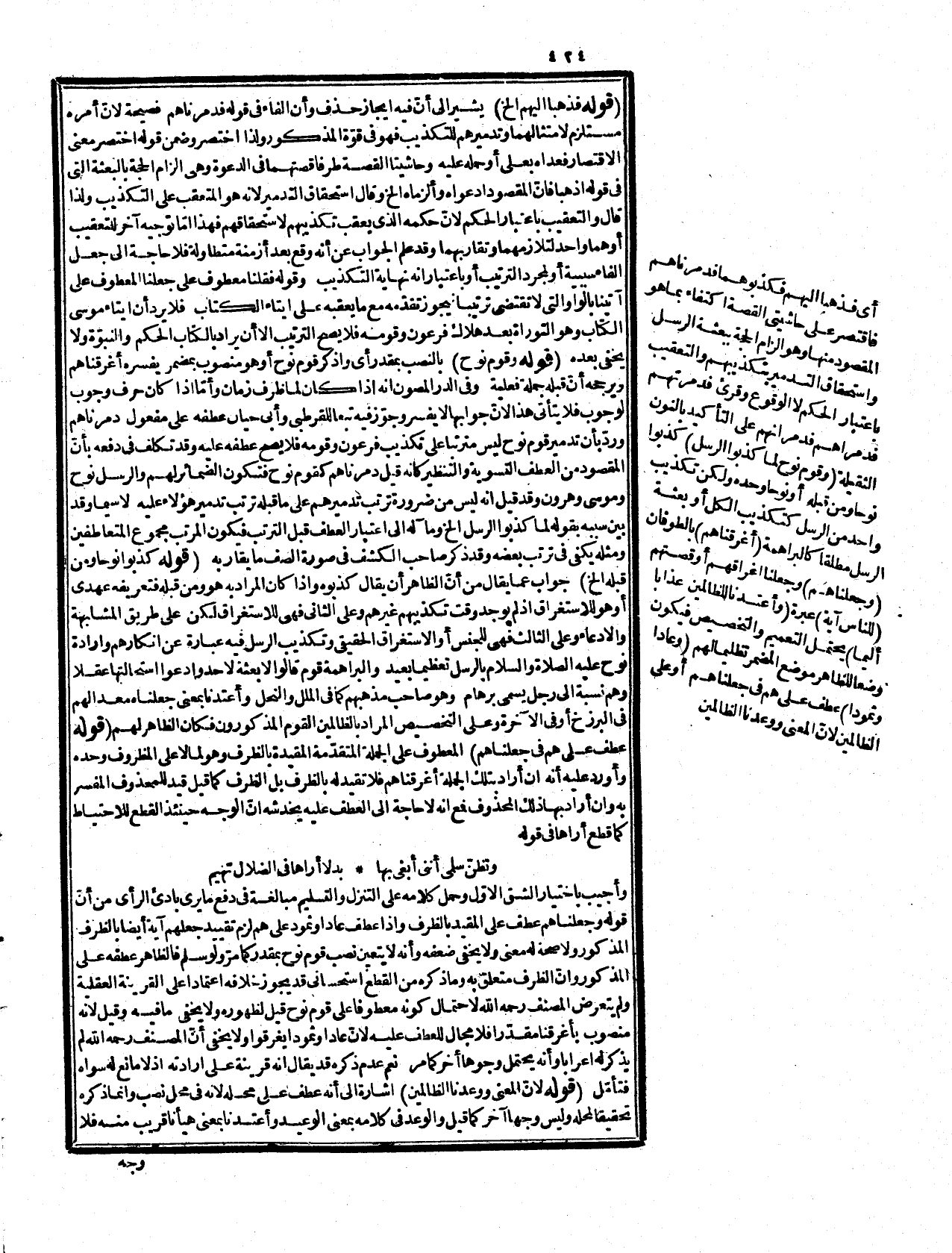 وقوله: فتتنا أي مزقنا وأهلكنا. قوله: (والثاني بتبرنا لأنه فارغ) أي لا معمول له بخلاف ضربنا لذكر له وتقديمه للفاصلة لا لإفادة القصر على أنّ المعنى كلاَ لا بعضاً كما قيل لإفادة لفظ كلا له والفرق بين النفي والانتفاء تكلف وقوله يعني قريشاً فالضمير لهم لا للمهلكين المار ذكرهم لعدم صحته معنى. قوله: (مروا مرارا) فسره به لأنّ أتى إمّا متعدّ بنفسه أو بإلى فتعديته بعلى لتضمته معنى المرور وأتى وان تعدى بعلى كما في القاموص لكنه بمعنى آخر يقال أتى عليه الدهر أي أهلكه فهو كقوله: {وَإِنَّكُمْ لَتَمُرُّونَ عَلَيْهِم مُّصْبِحِينَ وَبِاللَّيْلِ أَفَلَا تَعْقِلُونَ} [سورة الصافات، الآية: 137] قيل وقوله: مرارا أخذه من هذه الآية لأنّ القرآن يفسر بعضه بعضاً والأحسن إنه من قوله هنا أفلم يكونوا يرونها لأنّ كان والمضارع يدل على التجدّد والتكرر كما أضار إليه المصنف ولم يصرح به في أوّل الآية بأن يقول ولقد كانوا يأتون للإشارة إلى أنّ المرور ولو مرة كاف في العبرة ومتاجر جمع متجر بمعنى التجارة لا صيغة مفاعلة. قوله: (يمني سدوم) أي المراد بالقرينة سدوم وهي مدينة قوم لوط عليه الصلاة والسلام وهي بالسين والدال المهملتين وقيل إنه بذال معجمة والدال خطأ وصححه الأزهري وقال سذوم بالمعجمة اسم أعجمي وفي الصحاح إنه بالمهملة وفي الكشف الاعتماد على ما قاله الأزهري وهو اسم قاضيها في الأصل ولذا قيل أجور من سذوم ثم غلب على القرية وقوله: عظمى قر! قوم لوط بدل أو صفة لسدوم وهو إشارة إلى وجه إفراد القرية بالذكر مع تعدّد قراهم وقوله أمطرت الخ تفسير لمطر السوء. قوله: (في مرار مرورهم) إشارة إلى ما في المضارع من الاستمرار وفي كان من التكراو ولذا لم يقل أفلا يرونها وهو أخصر وأظهر. قوله: (بل كانوا كفرة الخ الما كان الرجاء في الأصل انتظار الخير ونشور الكفار لا خير فيه لهم فسره بوجو. منها أنه هنا بمعنى التوقع مجازا وهو يعم الخير والشر ومنها أنه على حقيقته وليس المراد بالنشور نشورهم بل نشور فيه خير كنشور المسلمين وهم لا يرجونه حتى يرجعوا عن كفرهم ومنها إنّ المراد بالرجاء الخوف على لغة تهامة كما مر تحقيقه وليس بمجاز كما توهم لأنّ جعله لغة يأباه بحسب الظاهر فالمراد بالنشور نشورهم والركاب الإبل المركوبة واحدها ركوبة أو لا واحد له من لفظه فواحده راحلة. قوله: (ما يتخذونك) إشارة إلى أنّ إن نافية وقوله موضع هزء أو مهزوأ* به يعني معنى تخاذه هزوا الاسنهزاء به فهزواً إمّا مصدر بمعنى المفعول مبالغة أو هو بتدير مضاف أي موضمع هزء ومعنى اتخاذه موضمع هزءانه مهزوء به وإنما أوّل ليصح حمله على