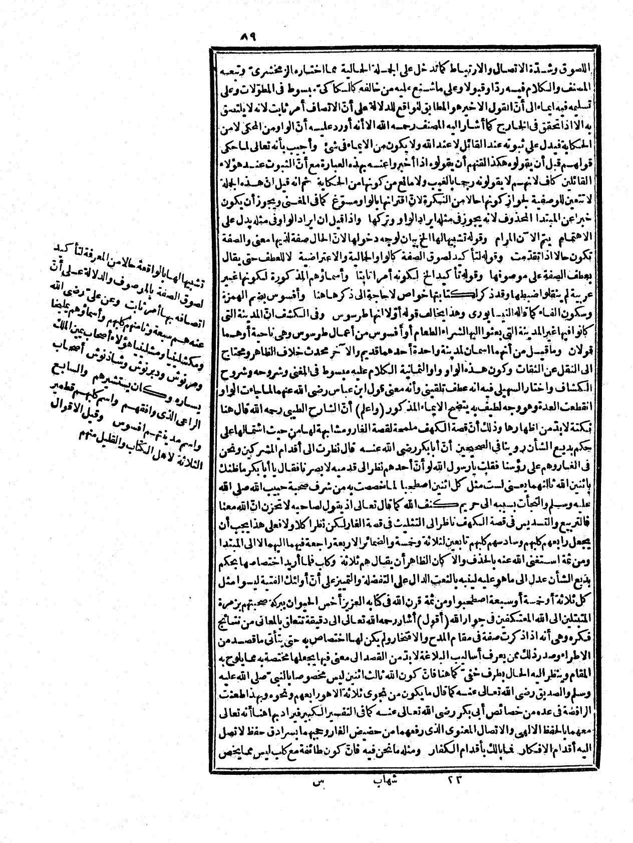 فيمدحوا به لكثرته في رعاء الشاء فيلاحظ فيه معنى وهو أنّ أخس الحيوانات تصذي لحفظهم وبذل نفسه في ملازمة أعتابهم حتى التحق بهم وعد معهم وتشرف بذكر الله له، ولذا قال خالد بن معدان: ليس في الجنة من الدواب إلا كلب أهل الكهف وناقة صالح وحمار العزير، وقال بعضهم: من أحب أهل الخير نال بركتهم ... كلب أحب أهل فضل وصحبهم فذكره الله معهم في القرآن، فالتنظير في مجرد ذكر أمر عام يلوّح إلى أمر خاص هو المقصود منه والداعي إلى ذكره وبهذا يتعين كونه صفة في الآية والحديث لأنه الأصل في الجمل المادحة فهو نظيره مع قطع النظر عن الصفتين والموصوفين، ولذا قال: كلا ولا ولم يذكر التثمين لاحتماله التلقين كما مرّ، قال: في قوانين البلاغة من محاسن الكلام نوع يقالى له التتبيع وهو أن يتجاوز عن المذكور إلى معنى آخر، كقوله: