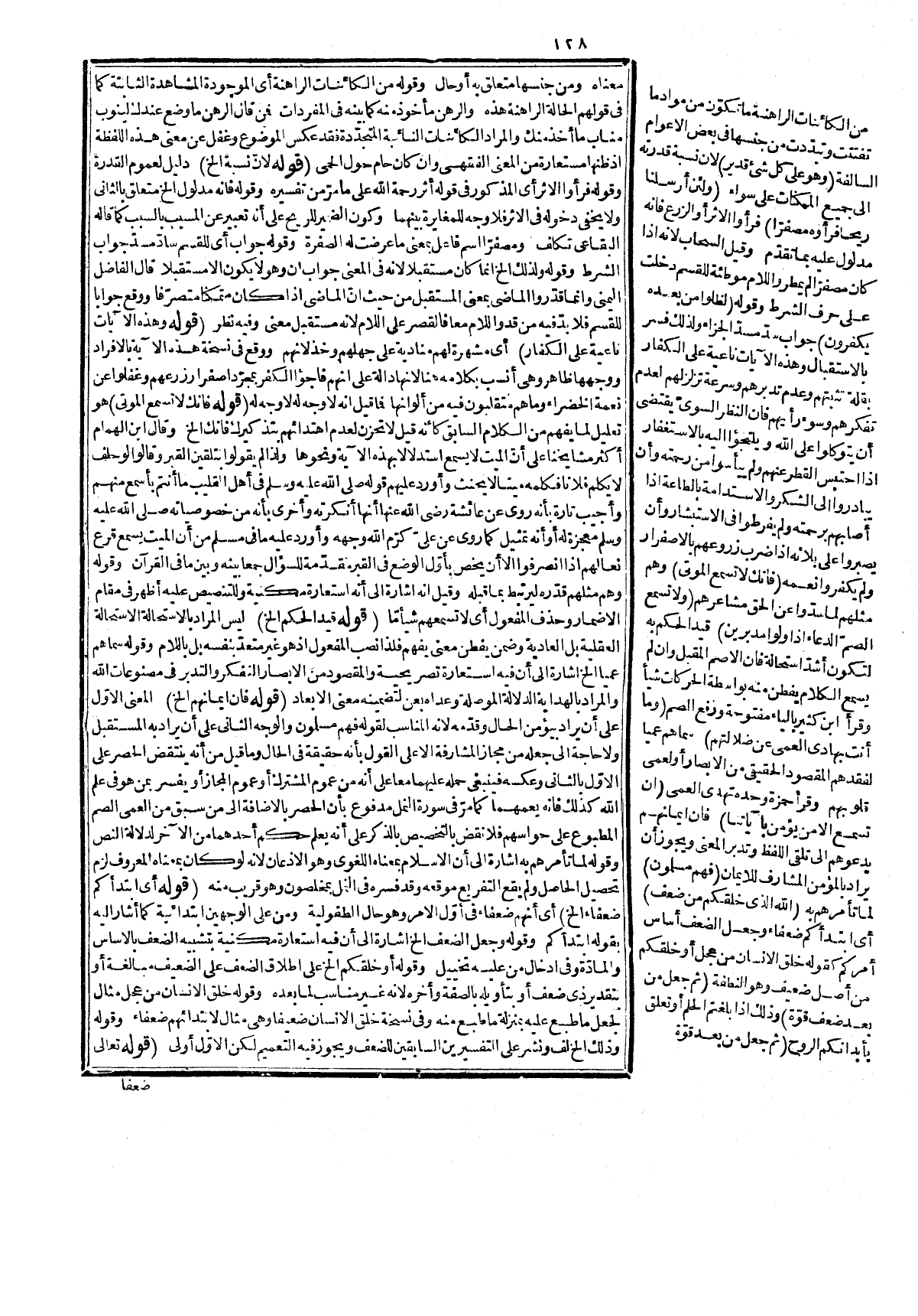 ( {ضعفاً وشيبة} ) المراد بالضعف هنا ابتداؤه ولذا أخر الشيب عنه أو الأعتم فقوله وشيبة للبيان أو للجمع بين تغير قواه وظاهره، وقوله إذا أخذ منكم السن هو مجاز يقال أخذ منه السن إذا كبر وهرم كأنّ آخر سنه أخذ قوّته أو عمره وهو على الوجهين. قوله: (والضتم أقوى الخ) قال في المعالم الضمّ لغة قريش والفتح لغة تميم، ولذا اختار النبيّ مجيد قراءة الضم لأنها لغته لا رداً للقراءة الأخرى فانهما متواترتان في السبعة، والحديث المذكور حديث حسن رواه أبو داود والترمذفي في السنن ورواه في النشر وقال: إنّ القرّاء لهذا اختاروا قراءة الضمّ، وهي مروية عن عاصم وفي رواية عنه ضئم الأوّلين وفتح الثالثة والفقر بالضمّ، والفتح ضدّ الغني. قوله: (والتنكير مع التكرير الخ) مراده بالمتأخر الأخير لمغايرته للأوّل إذ هو ضعف الشيخوخة وذاك ضعف الطفولية، وأمّا الثاني فهو عين الأوّل ونكر لمشاكلته لهما وكذا قوّة فلا وجه لما قيل إنه ظاهر في ضعف الأوّل، وأمّا الثاني مع الأوّل وقوّة الثانية فباعتبار أنّ المتقدّم أريد به الابتداء والمتأخر يشمل مراتب الابتداء والانتهاء، والتوسط وكلمة ثم لتراخي الابتداء واليه أشار المصنف بقوله أخذ منكم السن الخ، وكذا ما قيل إنّ هذا ليس لأنّ النكرة إذا أعيدت كانت غيرا لأنه أغلبيّ، ولعله قصد في كل منهما مغايرته للمقدم بحسب المراتب، ولذا أورده بثم في الجميع إشارة إلى أنّ لكل منها مراتب مع