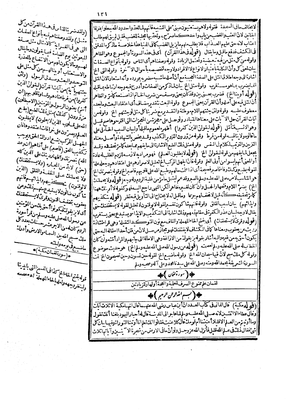 على ظاهره أو جعل عبارة عن جميع الأعمال الحسنة تصريحاً، واستتباعا لأن كل الصيد في جوف الفراء كما في الكشاف وظاهر كلام المصنف أنه على الثاني بيان دون الأوّل لأنّ الإحسان لا يختص بما ذكر فلا وجه لما قيل من أنه ينتظمها، وأنه أحسن من صنيع الزمخشري فتأمّل. قوله: (أو تخصيص لهذه الثلاثة من شعبه) أي من أقسام الإحسان جمع شعبة وظاهره أنه إذا كان بياناً عامّ بطريق الاستبتاع فيكون صفة مادحة للوصف أو الموصوف لا مخصصة، أو مبينة كما في الأوّل ولا مخالفة فيه لما في الكشاف كما توهم. قوله: (ولما حيل (بكسر اللام، وتخفيف الميم أي أعيد الضمير للتأكيد ولدفع توهم كون بالآخرة خبراً وجبراً للفصل بين المبتدأ وخبره، وقدم للفاصلة وقد مرّ الكلام عليه والكلام على قوله {أُوْلَئِكَ عَلَى هُدًى} تقدّم في البقرة، وقوله لاستجماعهم الخ ذكر العقيدة، وان لم تسبق لاستلزام ما ذكر لها أو لدخولها في عموم الأوّل. قوله: (ومن الناس الخ (عطف على ما قبله بحسب المعنى كأنه قيل من الناس هاد مهدفي ومنهم ضال مضل أو عطف قصة على قصة، وقيل إنه حال من فاعل الإشارة أي أشير إلى آياته حال كونها هد! ورحمة الحال أنّ من الناس الخ، وقوله يعني بفتح الياء معلوما أي يهم وقيل إنه بضمها مجهولاً أي يقصد وهذا كما قال الحسن اللهو ما يشغل عن الله. قوله: (والإضافة بمعنى من الخ) هذا بناء على أنّ إضافة العامّ المطلق بيانية، وهو مذهب لبعض النحاة كما في شرح الهادي وذكره الدماميني في شرح التسهيل إذ جعل إضافة يومثذ بيانية، وان صرّح العصام بخلافه واغترّبا بعض المتأخرين فاعترض على المصنف بأنه مخالف لكلام النحاة، وقوله إن أراد الخ فالتعريف للعهد. قوله: (وتبعيضية إن أراد به الآعتم منه) تبع فيه الزمخشريّ وهو مذهب لقوم من النحاة كابن كيسان والسيرافي قالوا إضافة ما هو جزء من المضاف إليه بمعنى من التبعيضية واستدلوا بفصله بمن كقوله: