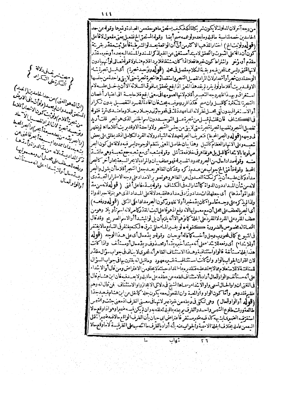 أو الضمير الذي في صلته لا الأرض والبحر بمعنى بحرها بنيابة أل عن الضمير الرابط للاسمية على تقدير اعتبار أو أولويته، وما قيل من أن البحر على هذا يعم إلا بحر بقرينة الإضافة ويفيد خروج السبعة عن بحار الأرض والأوّل يحتمل العهد وعدم العموم كما مر ردّ بأنه لا فرق بينهما بل الأوّل في الجنسية، والثاني في العهدية أظهر لأنه أصل الإضافة وكون الأرض شاملة لجميع الأقطار لا ينافي العهدية كما توهم لأن المعهود البحر المحيط، وهو محيط بها كلها. قوله: (بالعطف على اسم أن) ويمده خبر له أي لو ثبت أن البحر ممدود الخ ولا يستقيم أن يكون يمذه حالا لأنه يؤذي إلى تقييد المبتدأ الجامد بالحال، ولا يجوز لأنها البيان هيئة الفاعل أو المفعول والمبتداً أليس كذلك ويؤدي أيضاً إلى كون المبتدأ لا خبر له لأن أقلام لا يستقيم أن يكون خبراً له كما في أمالي ابن الحاجب يعني والتقدبر خلاف الظاهر، واذا كان من الاشتغال تدخل لو على المضارع وهو جائز، والقراءة بالتاء الفوقية شاذة والفعل في هذه الفراءة مضارع مد الثلاثين من مد النهر ومذه، وأمده المزيد قال ابن جنى أنه مستفاد من إمدأد الجيش. قوله: (وقرئ يمدّه) أي مضارع مد ويمدّه أي مضارع أمد، وقوله بالياء والتاء أي فيهما فليحرر وقوله وايثار جمع القلة أي اختياره في النظم على جمع الكثرة المناسب بحسب الظاهر للمبالغة، وهذا بناء على أن جمع المؤنث السالم كجمع المذكر جمع قلة وهو المشهور، وكون ما لا تفي البحار بكتابته قليلاً بالنسبة إلى جميع معلوماته، وقوله للإشعار إشارة إلى أن جمع القلة المعرّف باللام أو الإضافة قد يفيد الاستغراق، والعموم لكنه لكون أصل وضعه القلة يشعر بما ذكر فلا يتوهم أن المفيد للقلة هو المنكر كما قيل، وأمّا اختياره في أقلام فلأنه لم يعهد له جمع سواه وقلام غير متداول فلا يحسن استعماله، وأعلم أدة لو هنا ليست معناها المشهور من انتفاء الجواب لانتفاء الشرط أو العكس لاقتضائها نفاد الكلمات بر هي دالة على ثبوت الجواب، أو حرف شرط في المستقبل وتفصيله في المغني. قوله تعالى: ( {إِنَّ اللَّهَ عَزِيزٌ} الخ) تعليل لعدم نفاد كلماته، وقوله سألوا الخ على كونها مدنية كما مر وما بعده على كونها مكية، وهذا سبب النزول ووجه الجواب أن كون فيها علم كل شيء على تقدير تسليمه المراد به كل شيء مما يحتاجون إليه من أمور دينهم كما في قوله ما فرطنا في الكتاب من شيء والا فمعلوماته تعالى، وكلامه المعبر عنها لا نهاية لهما. قوله: (إلا كخلقها وبعثها) يعني أنه على تقدير