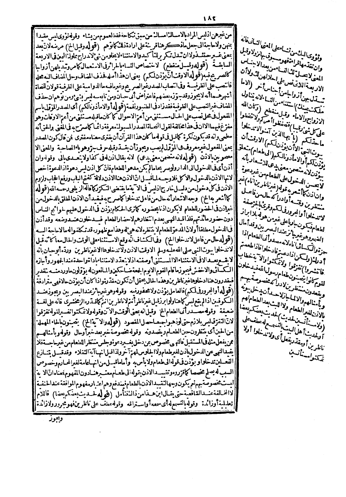 ويجوز عطفه على غير فيكون منصوبا كقوله: {وَلاَ الضَّالِّينَ} والفعل المقدر معطوف على المذكور ومستأنسين حينئذ حال مقدرة أو مقارنة، وقوله اللبث فسره به لأنه هو المؤذي له في الحقيقة وأما كونه إشارة إلى الدخول على غير الوجه المذكور فيشمل النظر والاستئناس، أو إليهما باعتبار المذكور فغير ملائم للسياق والسباق، وقوله إشغاله من أشغله وهي لغة، وإن كانت رديئة حتى وقع الصاحب لمن كتب له إن رأى مولانا أن يأمر لإشغالي ببعض أشغاله فوقع له من كتب إشغالي لا يصلح لأشغالي. قوله: (من إخراجكم) يعني أنّ فيه تقدير مضاف، وهو إخراج ب! ليل ما بعده فإنه يدل على أنّ المستحيي منه معنى من المعاني لا ذوإتهم ليتوارد النفي، والإثبات على شيء واحد كما يقتضيه نظام الكلام فمعناه لا يترك تأديبكم والتأديب بإخراجهم لأنه كان يؤذيه ووضع الحق موضمع الإخراح لتعظيم جانبه، كما أشار إليه بقوله يعني الخ وهذا على أنّ الإشارة للبث فإن كانت لغيره قدر المنع عما ذكر، وقيل إنّ فيه مقدراً أي ولا مخرجكم فيستحيي للفاء التعليلية واولاه عطف بالواو ورد بأنّ الفاء إنما تدخل على المسبب ودخولها على السبب بتأويله به فالفاء في محلها وفيما ذكره كثرة الإضمار، وعدم توارد النفي والإثبات على مورد واحد وفيه ما لا يخفى. قوله: (يعني أن إخراجكم الخ) في الكشف يريد أنه لو كان الاستحياء من أنفسهم لقال: {والله لا يستحى منكم} فإن قلت الاستحياء من زيد للإخراج مثلا هو الحقيقة والاستحياء من إخراجه توسع بجعل ما نشأ منه الفعل كأصله وكلاهما صحيح فيصح إيقاع أحدهما موقع الآخر، قلت أراد أنه لا بد من ملاحظة معنى الإخراج فإما أن يقدر الإخراج، ويوقع عليه فيكثر الإضمار ولا يتطابق اللفظ نفيا وإثباتا، وأما أن يقدر