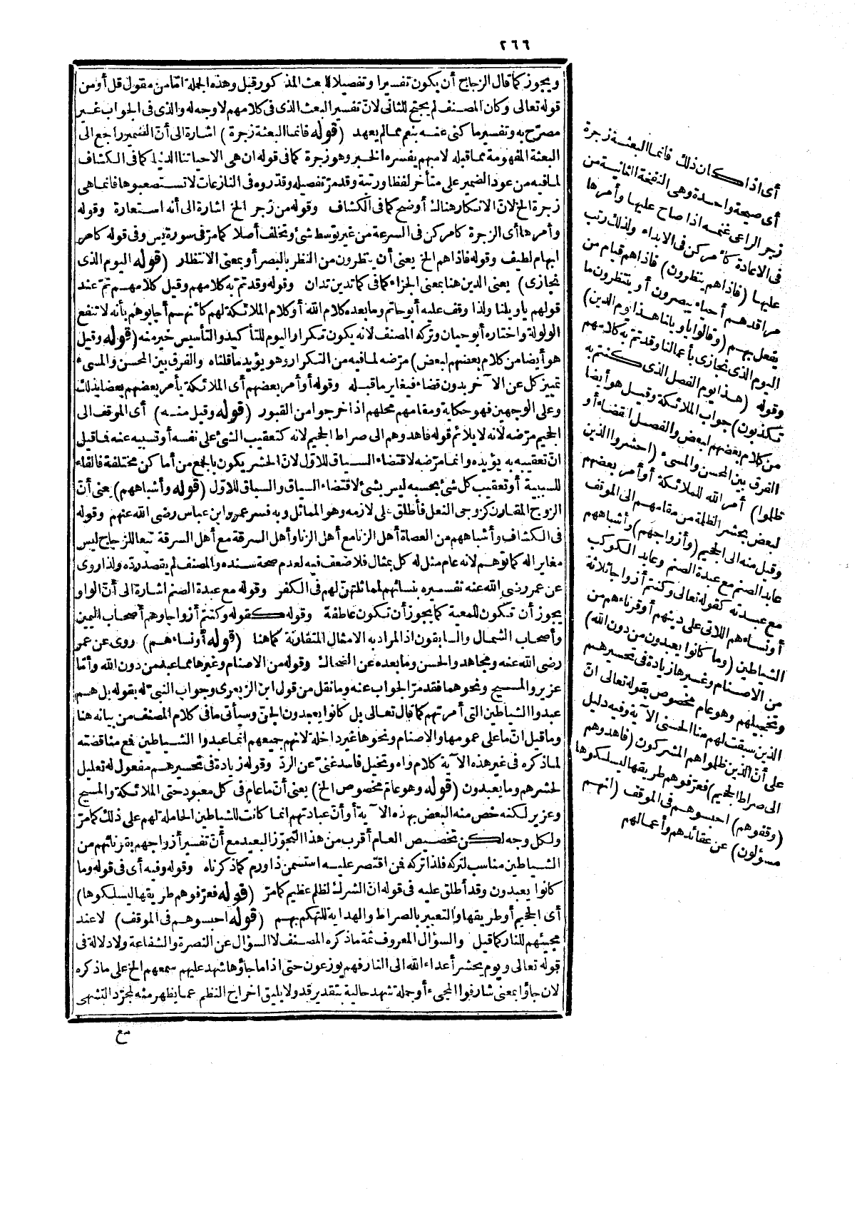 وا! راب هنا ففي نسخة أن يكون موقفهم وفي نسخة موقفهم متعدداً، وهي أظهرها وفي! خة أنه وفي نسخة موقفه بالإفراد وفي نسخة بعد الهدى، والتوقيف للسؤال وفي نسخة تركه والمراد منها واحد فموقفه بمعنى موقف هذا السؤال وموقفهم يعني لهذا السؤال أي لا مانع من إ! ا! ء على ظاهره لأنّ معنى هداية صراط الجحيم إراءته والدلالة عليه ولا مانع من تقدّمها على مو! فلا السؤال فانّ المؤخر عنه إنما هو الدخول في الطريق والوصول إليها، وأيضا يجوز أن جكون هذا سؤال آخر بعد السير أو الدخول على أنّ قوله: {مَا لَكُمْ لَا تَنَاصَرُونَ} تفسير له أو صراط الجحيم طريقهم له من قبورهم إلى مقرهم وهو ممتد فيجوز كون الموقف في بعض منه مؤخرا عن بعض، وهذا إيضاحه بما لا مزيد عليه، وقد خبطوا فيه خبطاً عجيباً كقول بعضهم معنى هوله مع جواز أن يكون موقف ما لكم لا تناصرون جواز كون موقف السؤال موقف سؤال! ا! كم لا تناصرون على حذف مضافين، ويحتمل أن يكون موقفه بضمّ الميم على صيغة اسم ا! ا! لى واعتبر الصاحب بالصاحب. قوله تعالى: ( {بَلْ هُمُ الْيَوْمَ مُسْتَسْلِمُونَ} ) جوّز في الإضراب أن يكون عن مضمون ما قبله أي لا ينازعون في الوقوف، وغيره بل ينقادون أو يخذلون أو عن قولى لا تناصص ون أي لا يقدر أحد على نصر أحد بل هم منضادون للعذاب أو هصخذولوه والانقياد لازم لطلب السلامة عرفاً فلذا استعمل فيه، وقوله يسلم بعضهم بعضاً أصل م! اه! سلمه بالتشديد والمراد يخذله يقال أسلمه لكذا إذ أخذله فقول ويخذله عطف تفسير له، والقرناء بمعنى الثياطين، وقوله للتوبيخ أي لا للاستعلام. قوله: (عن أق! وى لوجوه وأ! ظ الخ (!! ني أنّ الاتباع يقولون للرؤساء في مخاصمتهم هذا، وقد تجوّز به عن أحد هذه المعاني لأنّ يمين الإنسان أشرف وأقوى وبها يتيمن أيضاً ولذا يسمون اليسار شؤمى فتجوّز بها عن أحد هذه ا! افي على طريق الاستعارة لتشبيهها باليد اليمنى فيما ذكر، وتحرير معنى الآية أنّ قوله قالوا ا! خ! سسير لقولن يتساءلون بمعنى يتخاصمون فيقول بعضهم لبعض في الجحيم أي الاتباع للرؤساء إنكم كنتم تصدوننا بقوتكم عن اتباع الحق، وتزعمون أن ما أنتم عليه خير ودين حق فتخدعوننا وتفلوننا، ولذا أجابوهم بقولهم بل لم تكونوا الخ. قوله: (كأنكم تنفعونضا (متعلق ببم ما قبله أو بالأخير وهو الخير، وقوله نفع السانح الخ السانح والسنيح ما أتاك عن يمينك من طائر أو ظبي أو غيرهما ضد البارج ومن العرب من يتيمن بالسانح ويتشاءم بالبارج ومنهم من يتمثماءم بالسانح، ويتيمن بالبارج قاله الخليل في العين وفي النهاية السانح ما جاء من جهة يسارك إلى يمينك والبارح ضدّه فقد علمت أنّ لأهل اللغة في تفسيرهما مذهبين وأنّ العرب في