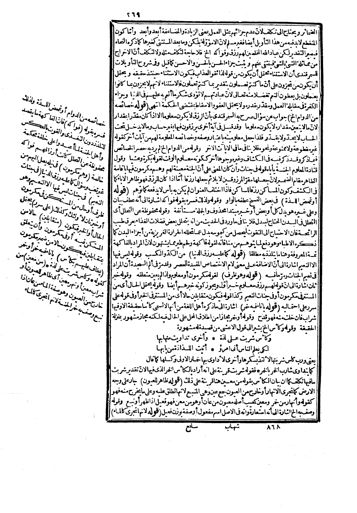 هذا بناء على أنها خمر حقيقة لكنها وصفت بالمعين تشبية لها به لكثرتها حتى تكون أنهاراً جارية في الجنان وقوله للأشعار بأنّ ما بالمد والقصر، وهو وجه آخر مبني على أنه ماء جار على الحقيقة لكنه في حلاوة العسل وله تفريح ونشوة كنشوة الخمر ووجه الإشعار ظاهر لأنّ جعله خمراً يفيد أن فيه لذته، ونشوته وكونه معيناً يدل على ماء أو جنس من المشروب يضاهيه في لونه ورقته فلا يخفى وجه الإشعار لمن له شعور، وفائدته على الأوّل وصف الخمر بالرقة واللطافة، وعلى الثاني وصف الماء باللذة والنشوة. قوله: الكمال الفذة (بدل من قوله لما يطلب أو متعلق بجامع تعليل له، وقوله وكذلك أي على الاحتمالين، وقوله أيضاً أي كما أن قوله من معين صفة، وقوله للمبالغة بجعل الملتذ به عين اللذة، وقوله كطب بفتح الطاء بمعنى طبيب حاذق فهو فعل بسكون العين صفة كصعب بمعنى فعيل أو بكسرها كخشن أو بفتحها كحسن فسكن للإدغام، وقوله في البيت ولذ فسره في الكشاف بنوم وفسره في الأساس يعيش لذيذ وهو الظاهر وعلى كليهما فهي شاهد لما ذكره لأنه على الأوّلين ليس باسم جامد له بل معنى لذيذ بغلب على النوم، والتردد فيه لا وجه له والصرخدي الخمر منسوب لصرخة بلدة بالشام ينسب إليها الخمر الجيد، والحدثان بفتحات شدائد الدهر ونوائبه التي تحدث فيه. قوله تعالى: ( {لَا فِيهَا غَوْلٌ} ) قدم فيه الظرت