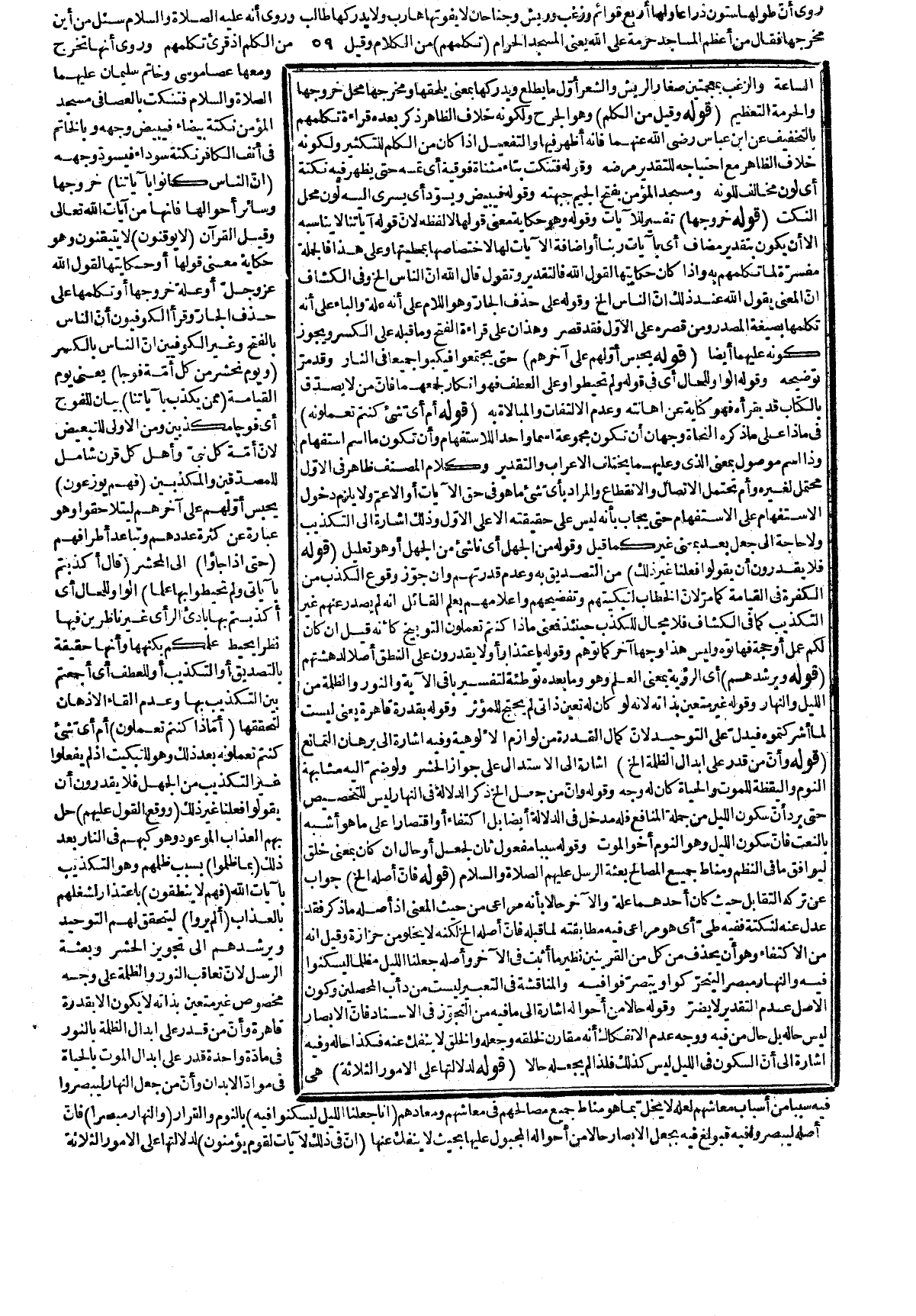 التوحيد والحشر وبعثة الرسل، وقوله في الصور بضم الصاد وفتح الواو وجمع صووة بناء على أنّ الصور بسكون الواو بمعناه، والبوق بضم الباء وسكون الواو والقاف معرّب بورى وعلى هذا فهو استعارة تمثيلية شبه هيئة انبعاثهم من الصور إلى المحشر وقد نفخ في الصور بجيش نفخ لهم في المزمار المعروف فساروا إلى ما يريدون، وقوله من الهول أي هول النفخ أو هول المحشر. قوله: (لأنه صعق مرّة) أي في الطور، وقد سمع الخطاب فجازاه الله على تلك الصعقة أنه لا يصعق يوم الفزع، وهذا ورد في الحديث ما يدلّ عليه، وقوله حاضرون الموقف إن كان الموقف منصوبا على الظرفية أي حاضرون لله في الموقف فظاهر، وإن كان مفعولاً له فعلى جعل حضور الموقف حضورا له لاختصاصه به وفي نسخة حاضرين على أنه حال، وقوله بعد النفخة الثانية لتعدّدها، وقد قيل إنها ثلاث، وقوله لتوحيد لفظ الكل
