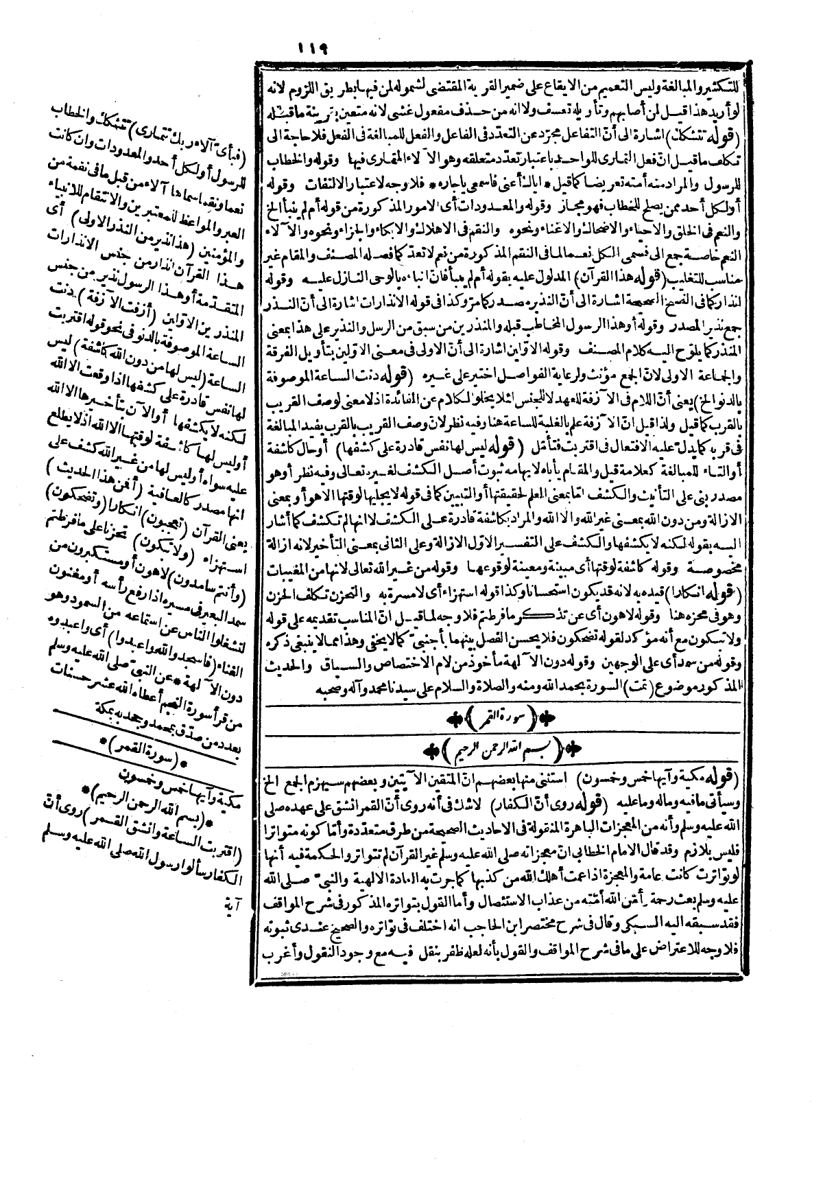 منه قوله: إنّ حديث (من كذب على (الخ قالوا: إنه غير متواتر مع أن رواه ستون من الصحابة فيهم العشرة المبشرة إذ لا يلزم مع تواتر هذا تواتر ذاك لجواز تخلف شرط فيه، وسبب تعرّضهم للتواتر طعن بعض الملاحدة بأن القمر يشاهده كل أحد فلو انقسم قطعتين تواتر، وشاع في جميع الناس، ولم يخف على أحد، والطبائع حريصة على إشاعة ما لم يعهد مثله ولا أغرب من هذا مع أنّ الملازمة غير لازمة لأنه في الليل، وزمان الغفلة ولا يلزم امتداده، ولا أن يرى إذ ذاك في جميع الآفاق لاختلاف المطالع، وقد قيل إنه وقع مرتين أيضا. قوله: (فانشق القمر) قيل: لم يقل فشق إشارة إلى أنه فعل الله أظهره على يديه ولو قيل إشارة إلى أنه في ذاته قابل للخرق والالتئام رداً على ملاحدة الفلاسفة كان أحسن. قوله: (وقيل الخ)