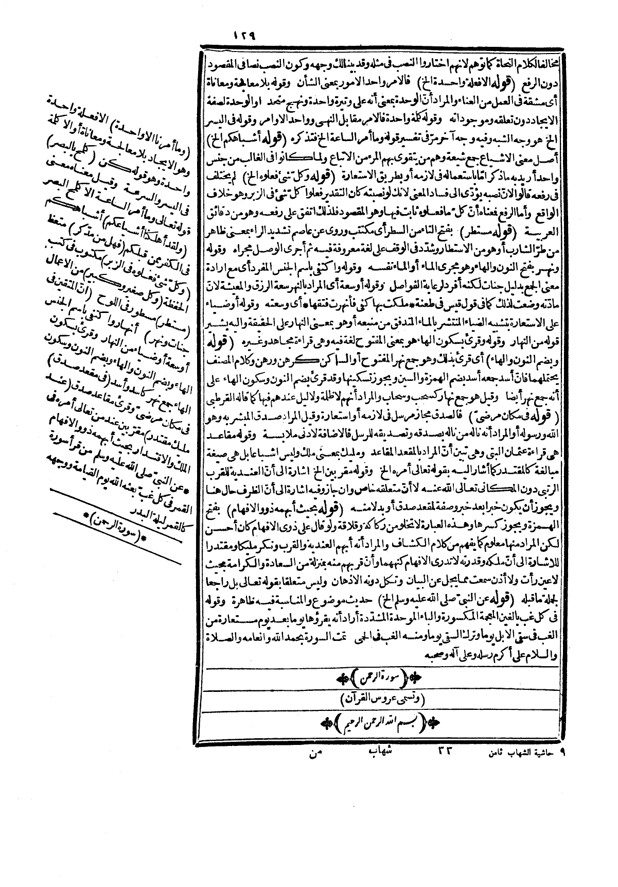 قوله: (مكية الخ) الأول قول ابن عباس، والثاني قول مقاتل، والثالث نقله في جمال القراء، وقال: إنه استثنى منها بعضهم يسأله من في السموات الخ، وانها ست أو سبع أو ثمان، وسبعون على اختلاف في بعضها هل هو آية أو بعض آية على ما فصله في الإتقان مما ليس هذا محله. قوله: (لما كانت السورة الخ) مناسبة الرحمة للنعم ظاهرة، والرحمن لنعم الدارين بناء على أنه عام إذ يقال: يا رحمن الدنيا، والآخرة كما مر تفصيله في أوّل الكتاب، وقوله: وقدم الخ بيان للنكتة فيما بدأ به وهو تعليمه للقرآن لأنّ المقصود الدين وأصله، وأجله القرآن فلذا قدم لتقدّمه رتبة، وإن تأخر تعليمه عن خلق الإنسان وجوداً، وقوله: أساس الدين لأنه يعلم به، ويؤخذ منه وبه يستدل، وقوله: إذ هو الخ تعليل للأعظمية، والأعزية وقوله: مصدّق الخ لف ونشر مرتب فتصديقه لنفسه لإعجازه لأنه يدل على أنه كلام الله، وإذا ثبت ذلك ثبت حقية ما فيه، وما طابقه فكان مصداقا لسائر الكتب السماوية. قوله: (ثم أتبعه) أي أتبع القرآن، وتعليمه المقدم ك! فه أي ذكره على عقبه، وقوله: إيماء مفعول له لتعليل ذكره بعده من غير فاصل ولقربه من معنى الإشعار عداه بالباء، وكان الظاهر إلى، وقوله: من البيان بيان لما، وقوله: وهو التعبير الخ تفسير للبيان، والضمير ما يضمر في القلب، ويطلق عليه نفسه، وكلاهما صحيح هنا، وقوله: لتلقي الوحي الخ خبر لأنّ خلق البشر الخ. فإذا كان خلقهم إنما هو في الحقيقة لذلك اقتضى اتصاله بالقرآن، وتنزيله الذي هو منبعه، وأساس بنيانه فما قيل: إنّ قوله لتلقي الوحي متعلق بخلق البشر سهوا لا أن يريد للتعلق المعنوي وهو خلاف الظاهر. قوله: (وإخلاء الجمل الخ أليس المراد بإخلائها عنه أنّ حق الثلاث أن تعطف حتى يرد عليه أنّ