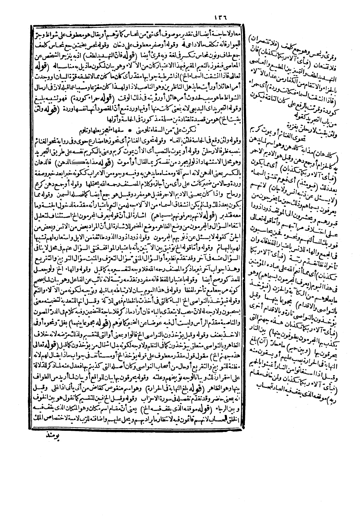 تعالى: {أَفَمَنْ هُوَ قَآئِمٌ عَلَى كُلِّ نَفْسٍ بِمَا كَسَبَتْ} [سورة الرعد، الآية: 33] . قوله:) أو مقام الخائف عند ربه الخ (أي المقام لمن خاف، واضافته للرب لأنه عنده فهو كقول العرب ناقة رقود الحلب أي رقود عند الحلب فذهب الكوفيون إلى أنه بمعنى عند وزادوا الإضافة العندية، والجمهور على أنها لامية كما صرّح به شزاح التسهيل، وليس من الإضافة لأدنى ملابسة أيضا، وقوله: بأحد المعنيين أراد به معنيي المقام، وهو كونه اسم مكان أو مصدرا ولا فرق بينه، وبين الأوّل إذا كان أسم مكان إلا في تخصيص المكان بالخائف، وتغاير الإضافة على رأي الكوفيين وأما على الثاني فهو ظاهر لأنّ القيام على ظاهره لا بمعنى الحفظ، والإضافة غير تلك الإضافة، وقوله: تفخيما وتهويلا لأنّ العندية، والمكانية محال في حقه تعالى فالمراد بها ذلك فما قيل: المراد أنه باحد المعنيين المذكورين، وهو موقفه الذي يقف فيه للحساب، ويحتمل أن يريد بأحد المعنيين أيهما كان لكن لا تخلو صحة المعنى الثاني عن تكلف كلام ناشئ من قلة التدبر. قوله: (أو ربه) أي التقدير خات ربه، ومقام مقحم، وليس المراد أنه زائد حقيقة بل زيادته بالنظر إلى أصل المعنى المراد، وأنه يصح بدونه لأنه غير زائد بل هو ذكر لأنّ الكلام كناية عن خوف الرب، واثبات خوفه له بطريق برهانيئ بليغ لأنّ من حصل له الخوف من مكان أحد يهابه، وإن لم يكن فيه فخوفه منه بالطريق الأولى، وهذا كما يقول المترسلون: المقام العالي، والمجلس السامي، وكما في الشعر المذكور، واليه أشار المصنف بقوله: للمبالغة. قوله: (كقوله الخ) هو من قصيدة للشماخ مدح بها عرابة بن أوس الخزرجي أولها: