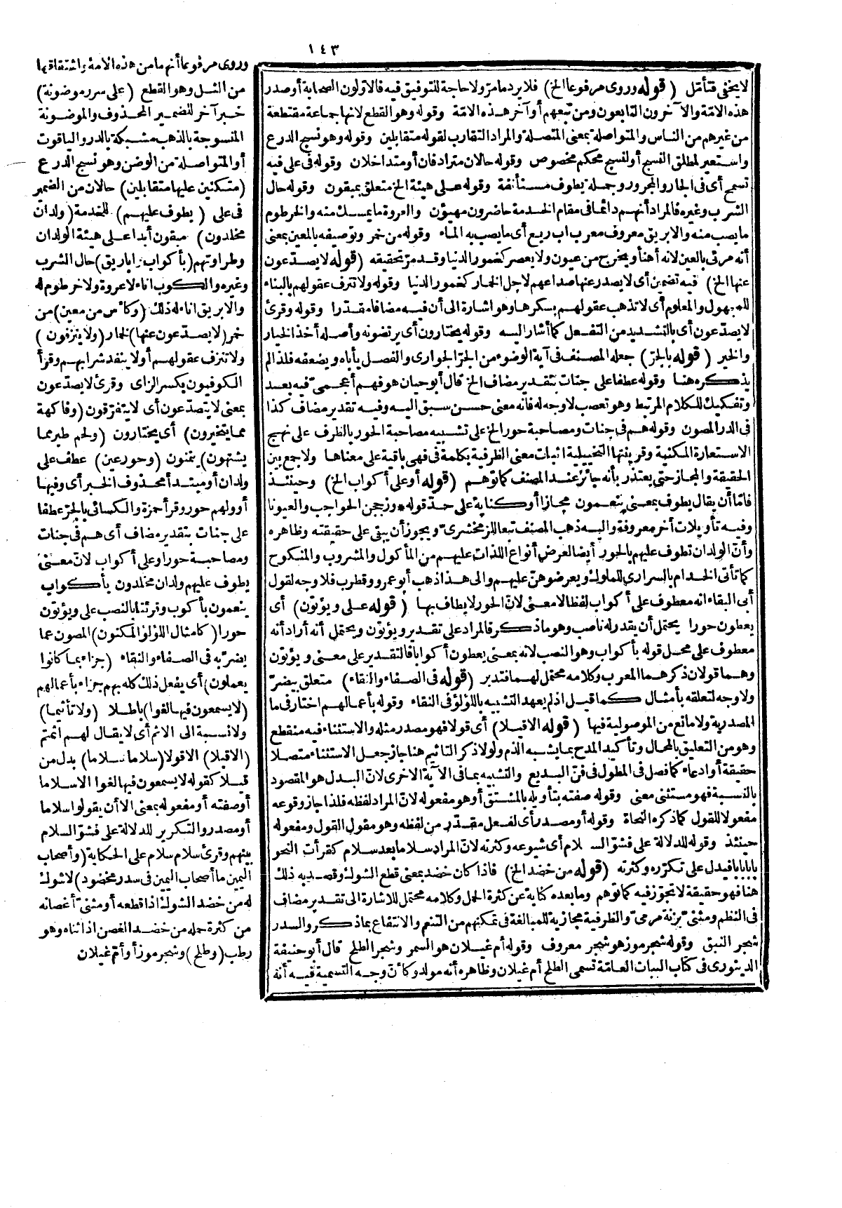 هو من إطلاقه، وقوله: أو مصبوب فالمراد سيلانه مطلقا. قوله: (إشعارا بالتفاوت بين الحالين) أي حال السابقين، وأصحاب الميمنة كالتفاوت بين أهل المدن، والبوادي المشابهة أحوالهم لأحوالهم فإنّ نعيم الأوّلين أبلغ، وأعظم كما نشاهده، وحال أهل المدن كونهم على سرر تطوف خدامهم عليهم بأنواع الملاذ كما مرّ، وحال البوادي إذا تنعموا نزولهم أماكن مخصبة فيها مياه وأشجار، وإليه الإشارة بقوله في سدر الخ. قوله: (كثيرة الأجناس) حمله عليه دون كثرة أفراد جنس أو نوع واحد لأنه أبلغ، وقوله: رفيعة القدر فرفعها معنويّ بمعنى شرفها، وقوله: منضدة أي بعضها فوق بعض فترتفع بذلك كما يشاهد في الدنيا، وقوله: وقيل الفرس النساء فإن النساء تسمى فراشاً كما تسمى لباسا على الاستعارة، وقوله: ويدل عليه قوله الخ وجه الدلالة فيه أنّ الضمير يعود على مذكور بخلافه على الأوّل فإنه يعود على ما فهم من السياق، والفراس، والاستخدام بإرجاع الضمير إلى الفرس بمعنى النساء بعد إرادة معناها المعروف منها كما ذكره البقاقي بعيد هنا كما لا يخفى، والمحشي ذكره من عنده كأنه لم يره. قوله: (أي ابتدأناهن ابتداء جديدا الخ) أي إن أريد النساء التي ابتدأ خلقهن من الحور فالمعنى ابتدأناهن ابتداء جديداً من غير ولادة ولا خلق أوّل وهو المراد بالإبداء، وإن أريد التي كن في الدنيا فالمراد أعيد إنشاؤهت من غير ولادة، وهذا هو المراد بكونه جديدا أيضا، وقوله: شمطا جمع شمطاء، وهي المختلط سواد شعرها ببياضه تشبيهاً والرمص جمع رمصاء بالمهملات وهي التي في طرف عينها وسخ أبيض متجمد كما يرى في العجائز والشيوخ، وقوله: على ميلاد أي متوافقة على ميلاد واحد، وسن متحد فالميلاد اسم زمان وهو تفسير للأتراب، ولذا لم يفسره فيما سيأتي وعلى هذا فقوله: فجعلناهن أبكارا على ظاهره، والجعل بمعنى التصيير وأبكارا مفعول ثان، وعلى الأوّل الجعل بمعنى الخلق، وأبكارا حال أو مفعول ثان من قبيل ضيق فم الركية فتأمّل. قوله: (جمع عروب) كصبور، وصبر وتسكيته للتخفيف، وقوله: بنات ثلاث، وثلاثين اختير هذا لأنه أتم السن، والإنسان فيه أقوى لأنهم جرد مرد كما ورد في