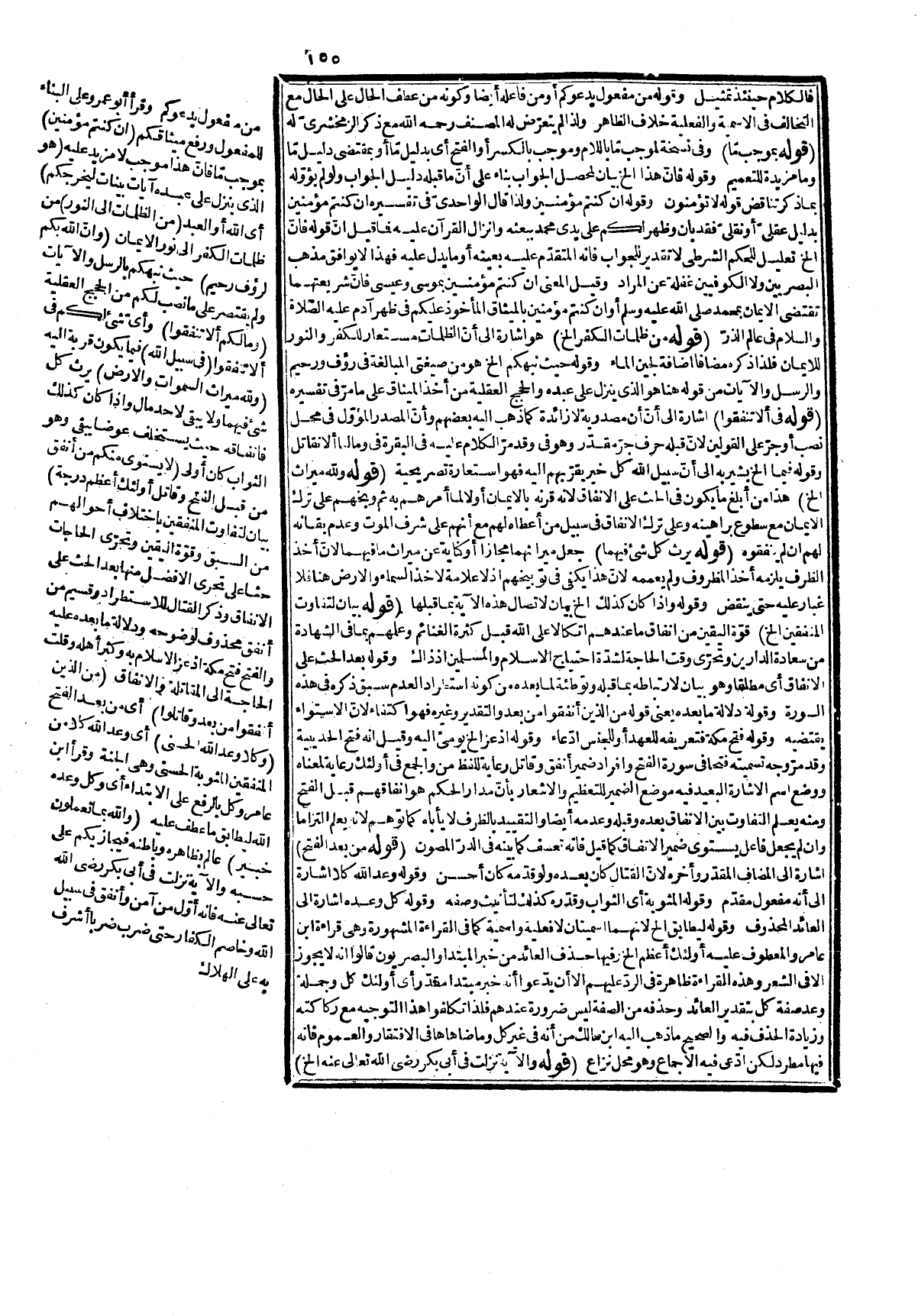 اتصف بذلك، وكونه أكمل أفراده يكفي لنزولها فيه، والخطاب في قوله: لا تسبوا ليس للحاضرين، ولا للموجودين في عصره صلى الله عليه وسلم بل لكل من يصلح للخطاب كما في قوله: {وَلَوْ تَرَىَ إِذْ وُقِفُواْ} [سورة الأنعام، الآية: 27] الآية والمقام، لا يتحمل أكثر من هذا، وسيأتي فيه كلام في قوله: {وَسَيُجَنَّبُهَا الْأَتْقَى} [سورة الليل، الآية: 17] . قوله: (من ذا الذي الخ أليس الاستفهام على حقيقته بل هو للحث عليه، والمعنى أن من ينفق ماله فيما يرضى الله رجاء لما عند. من الفضل، والثواب رابح في عاقبته مصيب فيما قصده، وقوله: فإنه كمن يقرضه الخ تعليل لما قبله مع الإشارة إلى أنّ القرض مجاز عن حسن إنفاقه مخلصماً في أفضل جهات الإنفاق، وذلك إمّا بالتجوّز في الفعل فيكون استعارة تبعية تصريحية أو في مجموع الجملة فيكون استعارة تمثيلية، كما مرّ في سورة البقرة، ولكونها أبلغ اختارها في الكشف، وأما كون كلام الزمخشريّ هنا غير نص فيها فأمر سهل، والباء في قوله: بالإخلاص للملابسة، والمصاحبة وتحرّى معطوف عليه. قوله: (يعطي أجره أضعافاً اله كما مرّ في البقرة وقوله: أضعافا إما منصوب بيضاعفه، أو حال من أجره، وأما كونه مفعولاً ثانيا ليعطي فركيك لأنه يقتضي أنّ الأجر نفسه معطى، والتجوّز غير مقصود فيه وما بعده لا يأباه كما توهم. قوله: (وذلك الأجر المضموم إليه الأضعاف الخ) إشارة إلى أنّ الأجر كما زاد كمه زاد كيفه، وجملة له أجر كريم حالية لا معطوفة على قوله: فيضاعفه، ولو عطف فالمغايرة ثابتة بين الضعف،. والأجر نفسه كما في الكشف، وكريم بمعنى محمود مرضيّ كما مرّ، وقوله: كريم في نفسه يعني ليس أجر هنا مغايرا لما مرّ بل معناه أنه هو في نفسه كريم فجعل من باب التجريد كقوله: أو يموت كريم فتدبر. قوله:) على جواب الاستفهام باعتبار المعنى الخ) إشارة إلى ما قاله أبو عليّ الفارسيّ أنّ السؤال لم يقع عن القرض، وأنما وقع عن فاعله وأنما ينصب في جواب الفعل المستفهم عنه لكن من قرأبه حمله على المعنى قيل وهو ممنوع لأنه ينصب بعد الفاء في جواب الاستفهام بالأسماء، وإن لم يتقدم فعل نحو: أين بيتك فأزورك ومن يدعوني فأستجيب له، وهذا ناشئ من عدم الوقوف على مرادهم، والمسألة مبسوطة في شرح التسهيل فإنه نقل فيه من غير خلاف أنه يشترط فيه أن لا يتضمن وقوع الفعل احترازا من نحو لم ضربت زيدا فيجازيك لأنّ الضرب قد وقع فلا يمكن سبق مصدر مستقبل منه قالوا، ومن أمثلة ما لا يتضمن