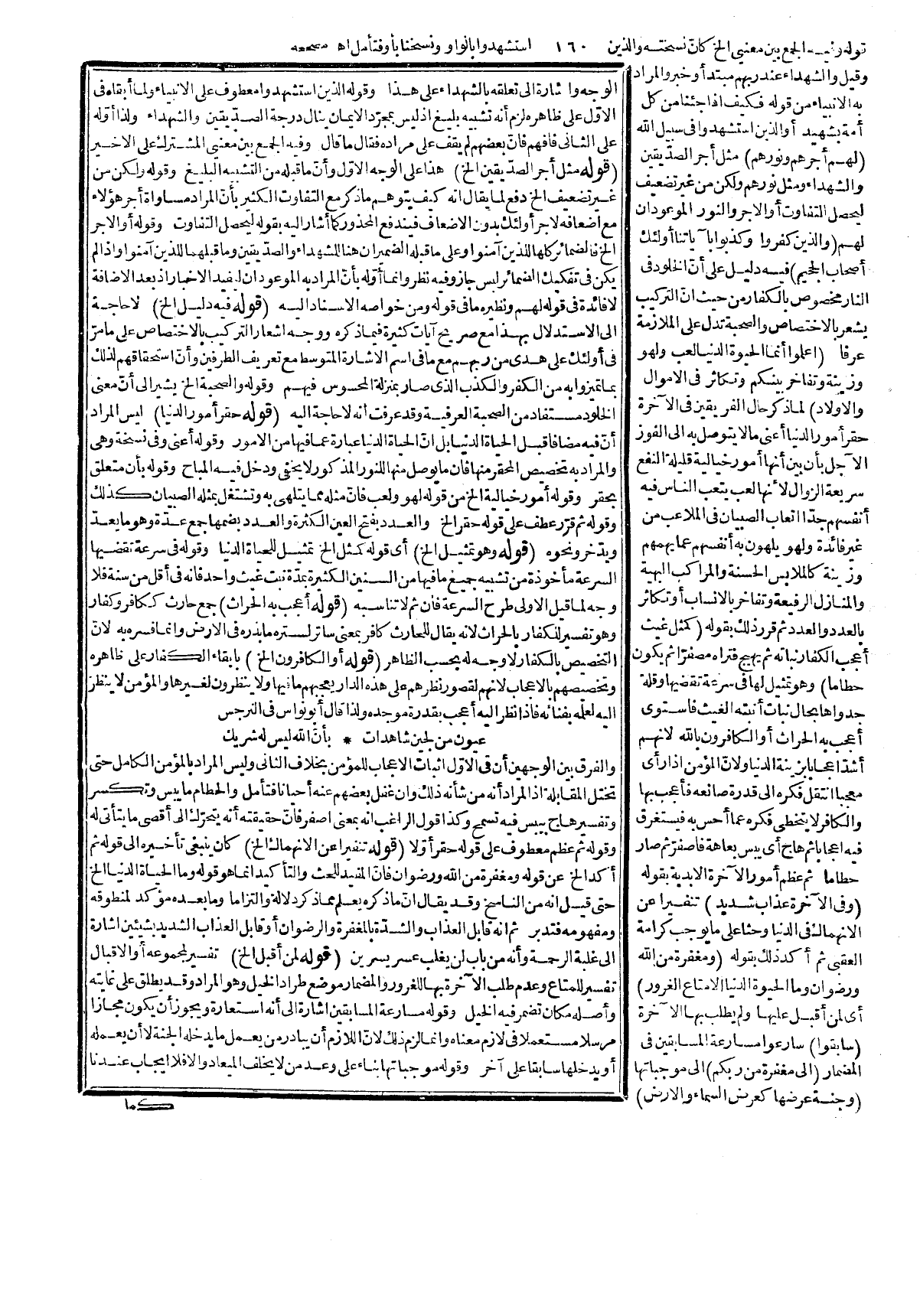 قوله: (فيه دليل على أنّ الجنة مخلوقة (أي موجودة الآن لقوله: أعدت بصيغة الماضي، والتأويل خلاف الظاهرة، وقد صرّح بخلافه في الأحاديث الصحيحة، وقوله: وأنّ الإيمان الخ لجعلها معدة للمؤمنين من غير ذكر عمل، وهو رد على المعتزلة والخوارج،! ثمادخال العمل في الإيمان المعدى بالباء غير مسلم، وقوله: في استحقاقها بضمير المؤنث للجنة كما هو في النسخ المعروفة فمن قال إنه مذكر، وتكلف لتأويله بأنه راجع للمؤمن المفهوم مما قبله أو للجنة بتأويل ما ذكر، ونحوه أتى بما أغنى الله عنه. قوله: (ذلك الموعود (من الجنة وإعدادها للمؤمنين وغيره مما فهم مما قبله، وليى الإشارة للجنة كما توهم حتى يقال حق التأويل ما وعد لأنها موعودة لا موعود أو يقال التذكير باعتبار الخبر، وقوله: من غير إيجاب من جعله فضلاً، وهو ردّ على من يوجب على الله ثواب المطيع كما تفرّر في الأصول، وقوله: فلا يبعد إشارة إلى أنه تذييل لإثبات ما ذيل به، وقوله: عاهة هي ما يصيب الزرع ونحوه، والآفة ما يعرض من المؤلم غير الأمراض كالجرج، والكسر وبه تصح المقابلة. قوله:) والضمير للمصيبة الخ) هذا هو الظاهر، وكونها للجميع، وأو لمنع الخلو تكلف ما لا داعي له، وقوله: إنّ ثبته فالإشارة إلى المصدر المفهوم من متعلق الظرت، وقوله: أثبت وكتب لكيلا الخ قيل: لو قال أخبر، وأعلم كان أولى وأنسب بقوله: فإنّ من علم الخ لأنّ تهوينه من الإعلام لا من الكتابة ولا يخفى أنه غني عن اللوح وما فيه عالم بكل ما كان، وما يكون فالإثبات فيه إنما هو لإعلام الملائكة، والرسل بجفاف قلم القضاء فذكره كناية عنه، وهو المراد لا الاكتفاء بالسبب المفضي إلى الإعلام فتأمّل. قوله: (فإنّ من علم أنّ الكل مقدّر الخ (كون الكل مقدراً لأنه لا قائل بالفرق فلا يرد أنّ المذكور هنا المصائب دون النعم، وغيرها فكيف يعلم منه الكل، وليس في النظم اكتفاء كما توهم، وقوله: ليعادل ما فاتكم في إسنادهما لشيء واحد، وكون الفاعل فيهما متحداً راجعا للنعم، والعائد مرفوع فيهما بخلاف القراءة الأخرى كما لا يخفى. قوله: (وعلى الأول) أي القراءة الأولى ترك فيها التعادل للنكتة المذكورة، وهو أنّ الفوات، والعدم