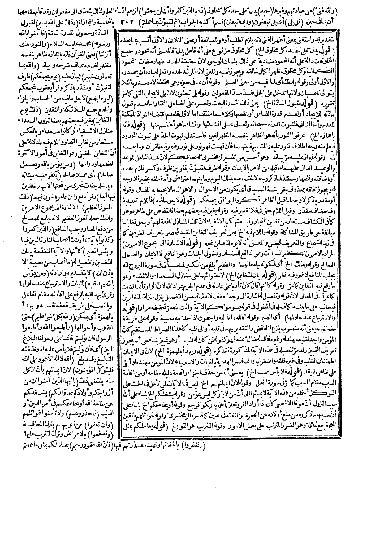 وقوله: يعطي الجزيل بالقليل يشير إلى أن في صيغة فعول مبالغة وأن الشكور في حقه تعالى معناه معطي الثواب الكثير بالعمل القليل، وحقيقة الشكر الاعتراف بنعمة المنعم، وقوله:) عن النبئ صلى الله عليه وسلم) حديث موضوع وآثار الوضع فيه ظاهرة ومناسبته للسورة لما ذكر فيها مما يجلب المنافع، ويدفع المضار وأنّ ثل مصيبة بإذنه وارادته فتأمّل تمت السورة بحمد الله ومنه والصلاة والسلام على سيدنا محمد وعلى آله وصحبه.