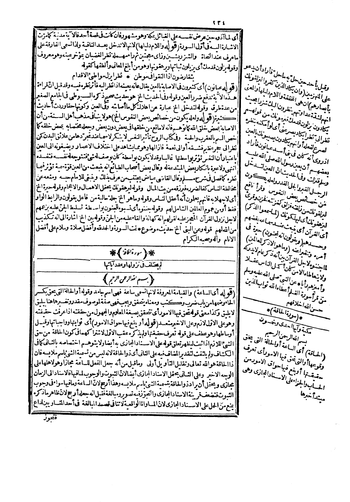 فتجوز إرادة المبالغة في ثبوت ما اشتملت عليه الساعة من الأمور وصدقه والتصوير بأنه بلغ مرتبة في الثبوت سرت لظرفه، ولو فرض عدم وصفه به ولا يخفى توجه مثله إلى الوجه الذي رجحه فإنّ الساعة توصف بالوجوب، والثبوت في نفسها فما الداعي لتقدير المضاف وتسمية الشيء باسم ملابسه وما القرينة عليه فقد ردّ بأنّ المقام مفام مبالغة فيعد داعياً وترينة للتجوّز لما فيه من التصوير، والمبالغة وما في الساعة لكونه مساوياً لها في وجوب الثبوت لم يكن محلاً لاعتبار المبالغة في اتصافه بالثبوت على الإسناد المجازي نعم يجوز أن يقال ة إنّ الساعة وما فيها، وإن استويا في وجوب الثبوت ونفس الأمر إلا أنّ ثبوتها لما كالن يثبت فيها ما فيها جعل الثبوت كأنه وصف بحا فيها فوصفت به الساعة على الإسناد المجازي مبالغة في اتصاف ما فيها