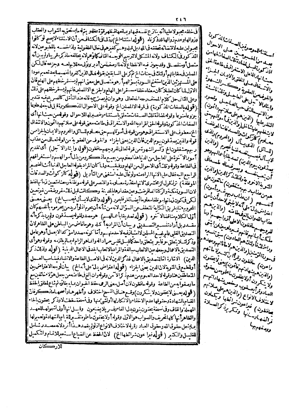 للأركان والهيآت وهذا توطئة لدفع توهم التكرار، وقوله: أولاً وآخراً أي في أول هذه الصفات وآخرها وقوله: باعتبارين هما ما صرّج به من اعتبار المداومة وانحبار التكميل، وانافتها بمعنى شرفها وعلوّ قدرها لأنها معراج المؤمنين ومناجاة الرحمن ومبالغات هذه الصلاة قد مر في المؤمنين بعضها، وهي من جهة ما يفيده الموصول من أنّ صلته أمر محقق معلوم، وتقديم هم المقوي للحكم وتقديم على صلاتهم الدال على أنّ محافظتهم لأمور الآخرة لا يتجاوزها لأمور الدنيا، وصيغة المفاعلة مع ما يعرف من تعظيم الموصوف لمن له ذوق سليم. قوله: (أولئك في جنات الخ) إيثاره على هؤلاء إمّا لبعد المشار إليهم في الفضل أو في الذكر باعتبار مبدأ الأوصاف المذكورة، وقوله: (مسرعين) يعني للحضور عنده ليظفروا من استماعه بما يجعلونه هزأ وعزين حال من الذين كفروا أو من الضمير في مهطعين على التداخل، وعن اليمين إمّا متعلق بعزين لأنه بمعنى متفرقين أو بمهطعين أي مسرعين عن ارجهتين أو هو حال أي كائنين عن اليمين. قوله: (جمع عزة) وهي الفرقة من الناس، وقوله: ل أصلها عزوة فلامها واو من عزوته بمعنى نسبته وأصل العز والضم لأنّ المنسوب مضموم لطمنسوب إليه وقيل: لامه ياء وقيل هاء وقوله: يحلقون حول رسول الله ىشببرو أي يجتمعون، وقوله: حلقاً حلقاً قيل: إنه بفتح الحاء وكسرها، وقيل: فتحها في الدرع وكسرها في الناس، وفي القاموس حلقة الباب والقوم وقد فتح لامها وتكسراً، وليس في الكلام حلقة محرّكة إلا جمع حالق أو لغية ضعيفة جمع حلق محرّكة وكيد انتهى. قوله: (تعليل له) أي للرح المذكور، وقوله: والمعنى الخ كان