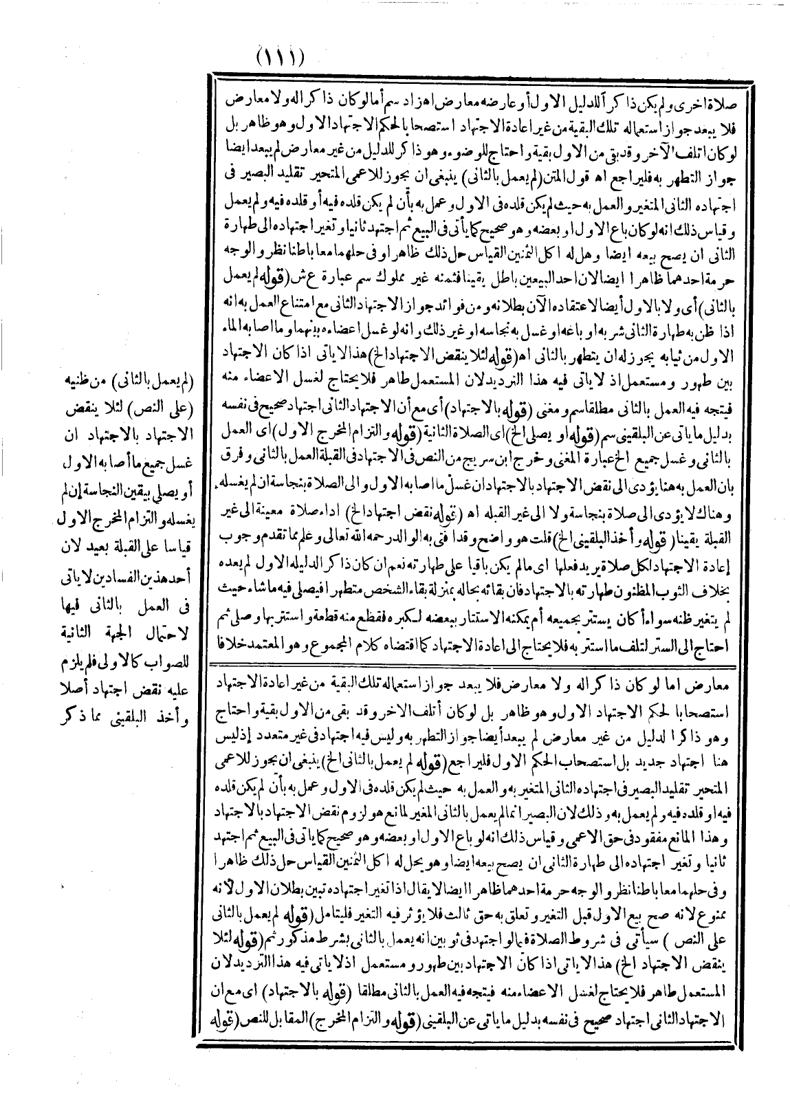 ـــــــــــــــــــــــــــــQصَلَاةٌ أُخْرَى، وَلَمْ يَكُنْ ذَاكِرًا لِلدَّلِيلِ الْأَوَّلِ أَوْ عَارَضَهُ مُعَارِضٌ اهـ زَادَ سم أَمَّا لَوْ كَانَ ذَاكِرًا لَهُ وَلَا مُعَارِضَ فَلَا يَبْعُدُ جَوَازُ اسْتِعْمَالِهِ تِلْكَ الْبَقِيَّةَ مِنْ غَيْرِ إعَادَةِ الِاجْتِهَادِ اسْتِصْحَابًا لِحُكْمِ الِاجْتِهَادِ الْأَوَّلِ وَهُوَ ظَاهِرٌ بَلْ لَوْ كَانَ أَتْلَفَ الْآخَرَ، وَقَدْ بَقِيَ مِنْ الْأَوَّلِ بَقِيَّةٌ وَاحْتَاجَ لِلْوُضُوءِ وَهُوَ ذَاكِرٌ لِلدَّلِيلِ مِنْ غَيْرِ مُعَارِضٍ لَمْ يَبْعُدْ أَيْضًا جَوَازُ التَّطَهُّرِ بِهِ فَلْيُرَاجَعْ اهـ.