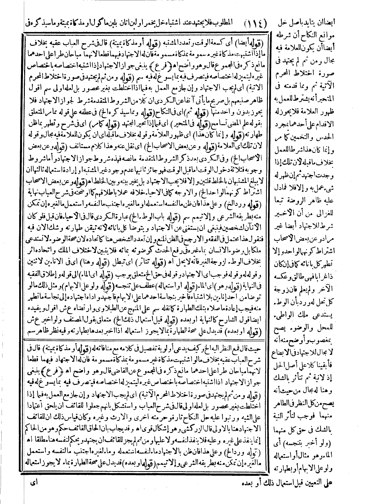 أَيْضًا أَنْ يَتَأَيَّدَ بِأَصْلِ حِلِّ الْمَطْلُوبِ فَلَا يَجْتَهِدُ عِنْدَ اشْتِبَاهِ خَلٍّ بِخَمْرٍ أَوْ لَبَنِ أَتَانٍ بِلَبَنٍ مَأْكُولٍ أَوْ مُذَكَّاةٍ بِمَيْتَةٍ وَمِمَّا سَيَذْكُرُهُ فِي مَوَانِعِ النِّكَاحِ أَنَّ شَرْطَهُ أَيْضًا أَنْ يَكُونَ لِلْعَلَامَةِ فِيهِ مَجَالٌ وَمِنْ ثَمَّ لَمْ يَجْتَهِدْ فِي صُورَةِ اخْتِلَاطِ الْمُحَرَّمِ الْآتِيَةِ.