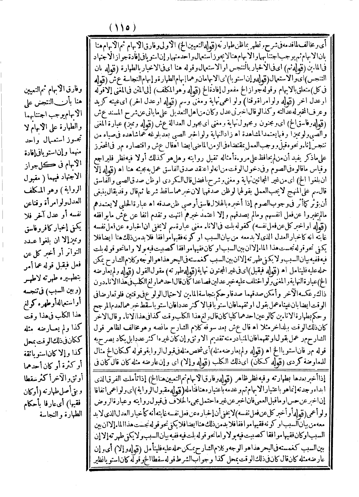 وَفَارَقَ الْإِبْهَامَ، ثُمَّ التَّعْيِينَ هُنَا بِأَنَّ التَّنْجِيسَ عَلَى الْإِبْهَامِ يُوجِبُ اجْتِنَابَهُمَا، وَالطَّهَارَةُ عَلَى الْإِبْهَامِ لَا تُجَوِّزُ اسْتِعْمَالَ وَاحِدٍ مِنْهُمَا، وَإِنْ اسْتَوَيَا فِي إفَادَةِ الْإِبْهَامِ فِي كُلٍّ جَوَازُ الِاجْتِهَادِ فِيهِمَا (مَقْبُولُ الرِّوَايَةِ) وَهُوَ الْمُكَلَّفُ الْعَدْلُ وَلَوْ امْرَأَةً وَقِنًّا عَنْ نَفْسِهِ أَوْ عَدْلٌ آخَرُ فَلَا يَكْفِي إخْبَارُ كَافِرٍ وَفَاسِقٍ وَمُمَيَّزٍ إلَّا إنْ بَلَغُوا عَدَدَ التَّوَاتُرِ أَوْ أَخْبَرَ كُلٌّ عَنْ فِعْلِهِ فَيُقْبَلُ قَوْلُهُ عَمَّا أُمِرَ بِتَطْهِيرِهِ طَهَّرْته لَا طَهُرَ (وَبَيَّنَ السَّبَبَ) فِي تَنَجُّسِهِ أَوْ اسْتِعْمَالِهِ أَوْ طُهْرِهِ كَ وَلَغَ هَذَا الْكَلْبُ فِي هَذَا وَقْتَ كَذَا، وَلَمْ يُعَارِضْهُ مِثْلُهُ كَ كَانَ فِي ذَلِكَ الْوَقْتِ بِمَحَلِّ كَذَا وَإِلَّا كَأَنْ اسْتَوَيَا ثِقَةً أَوْ كَثْرَةً أَوْ كَانَ أَحَدُهُمَا أَوْثَقَ وَالْآخَرُ أَكْثَرَ سَقْطًا وَبَقِيَ أَصْلُ طَهَارَتِهِ (أَوْ كَانَ فَقِيهًا) أَيْ عَارِفًا بِأَحْكَامِ الطَّهَارَةِ وَالنَّجَاسَةِ