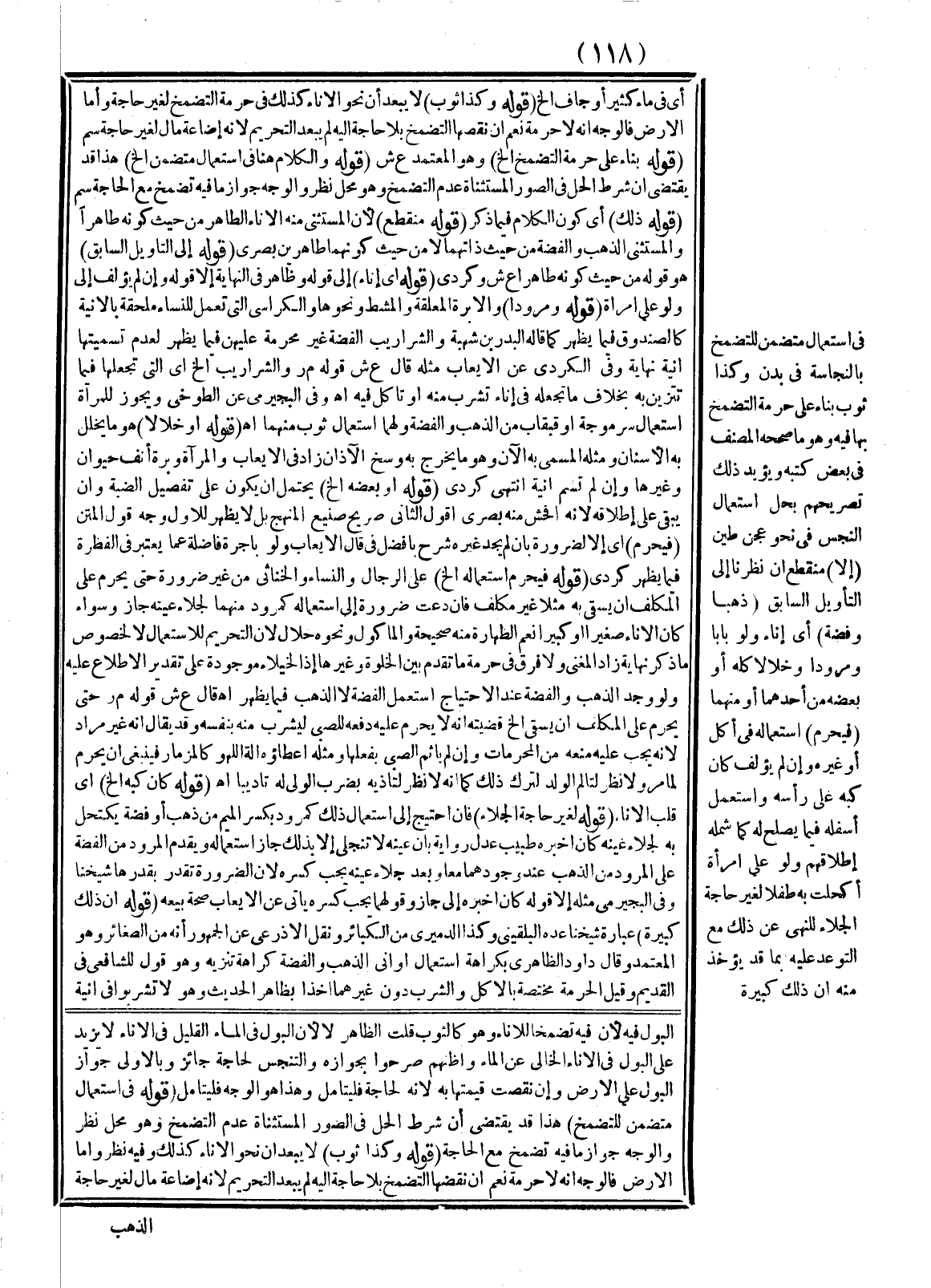 فِي اسْتِعْمَالٍ مُتَضَمِّنٍ لِلتَّضَمُّخِ بِالنَّجَاسَةِ فِي بَدَنٍ وَكَذَا ثَوْبٌ بِنَاءً عَلَى حُرْمَةِ التَّضَمُّخِ بِهَا فِيهِ وَهُوَ مَا صَحَّحَهُ الْمُصَنِّفُ فِي بَعْضِ كُتُبِهِ وَيُؤَيِّدُ ذَلِكَ تَصْرِيحُهُمْ بِحِلِّ اسْتِعْمَالِ النَّجِسِ فِي نَحْوِ عَجْنِ طِينٍ (إلَّا) مُنْقَطِعٌ إنْ نَظَرْنَا إلَى التَّأْوِيلِ السَّابِقِ (ذَهَبًا وَفِضَّةً) أَيْ إنَاءً وَلَوْ بَابًا وَمِرْوَدًا وَخَلًّا لَا كُلُّهُ أَوْ بَعْضُهُ مِنْ أَحَدِهِمَا أَوْ مِنْهُمَا (فَيَحْرُمُ) اسْتِعْمَالُهُ فِي أَكْلٍ أَوْ غَيْرِهِ وَإِنْ لَمْ يُؤْلَفْ كَانَ كَبَّهُ عَلَى رَأْسِهِ وَاسْتَعْمَلَ أَسْفَلَهُ فِيمَا يَصْلُحُ لَهُ كَمَا شَمِلَهُ إطْلَاقُهُمْ، وَلَوْ عَلَى امْرَأَةٍ أَكْحَلَتْ بِهِ طِفْلًا لِغَيْرِ حَاجَةِ الْجَلَاءِ لِلنَّهْيِ عَنْ ذَلِكَ مَعَ التَّوَعُّدِ عَلَيْهِ بِمَا قَدْ يُؤْخَذُ مِنْهُ أَنَّ ذَلِكَ كَبِيرَةٌ