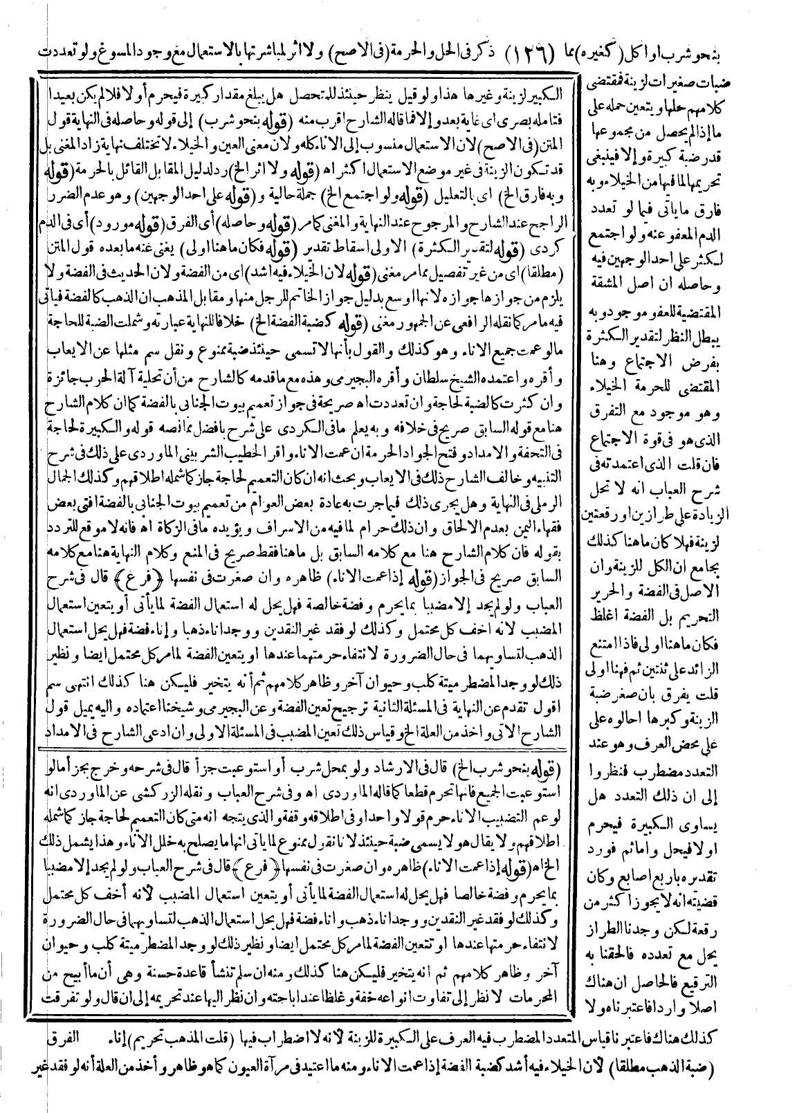 وَهَذِهِ مَعَ مَا قَدَّمَهُ كَالشَّارِحِ مِنْ أَنَّ تَحْلِيَةَ آلَةِ الْحَرْبِ جَائِزَةٌ وَإِنْ كَثُرَتْ كَالضَّبَّةِ لِحَاجَةٍ وَإِنْ تَعَدَّدَتْ اهـ صَرِيحَةٌ فِي جَوَازِ تَعْمِيمِ بُيُوتِ الْجُنَّابِي بِالْفِضَّةِ كَمَا أَنَّ كَلَامَ الشَّارِحِ هُنَا مَعَ قَوْلِهِ السَّابِقِ صَرِيحٌ فِي خِلَافِهِ، وَبِهِ يُعْلَمُ مَا فِي الْكُرْدِيِّ عَلَى شَرْحِ بَافَضْلٍ مِمَّا نَصُّهُ قَوْلُهُ وَالْكَبِيرَةُ لِحَاجَةٍ فِي التُّحْفَةِ وَالْإِمْدَادِ وَفَتْحِ الْجَوَادِ الْحُرْمَةُ إنْ عَمَّتْ الْإِنَاءَ، وَأَقَرَّ الْخَطِيبُ الشِّرْبِينِيُّ الْمَاوَرْدِيُّ عَلَى ذَلِكَ فِي شَرْحِ التَّنْبِيهِ، وَخَالَفَ الشَّارِحُ ذَلِكَ فِي الْإِيعَابِ وَبَحَثَ أَنَّهُ إنْ كَانَ التَّعْمِيمُ لِحَاجَةٍ جَازَ كَمَا شَمِلَهُ إطْلَاقُهُمْ، وَكَذَلِكَ الْجَمَالُ الرَّمْلِيُّ فِي النِّهَايَةِ وَهَلْ يَجْرِي ذَلِكَ فِيمَا جَرَتْ بِهِ عَادَةُ بَعْضِ الْعَوَامّ مِنْ تَعْمِيمِ بُيُوتِ الْجُنَّابِي بِالْفِضَّةِ أَفْتَى بَعْضُ فُقَهَاءِ الْيَمَنِ بِعَدَمِ الْإِلْحَاقِ، وَأَنَّ ذَلِكَ حَرَامٌ لِمَا فِيهِ مِنْ الْإِسْرَافِ وَيُؤَيِّدُهُ مَا فِي الزَّكَاةِ اهـ فَإِنَّهُ لَا مَوْقِعَ لِلتَّرَدُّدِ بِقَوْلِهِ فَإِنَّ كَلَامَ الشَّارِحِ هُنَا مَعَ كَلَامِهِ السَّابِقِ بَلْ مَا هُنَا فَقَطْ صَرِيحٌ فِي الْمَنْعِ.