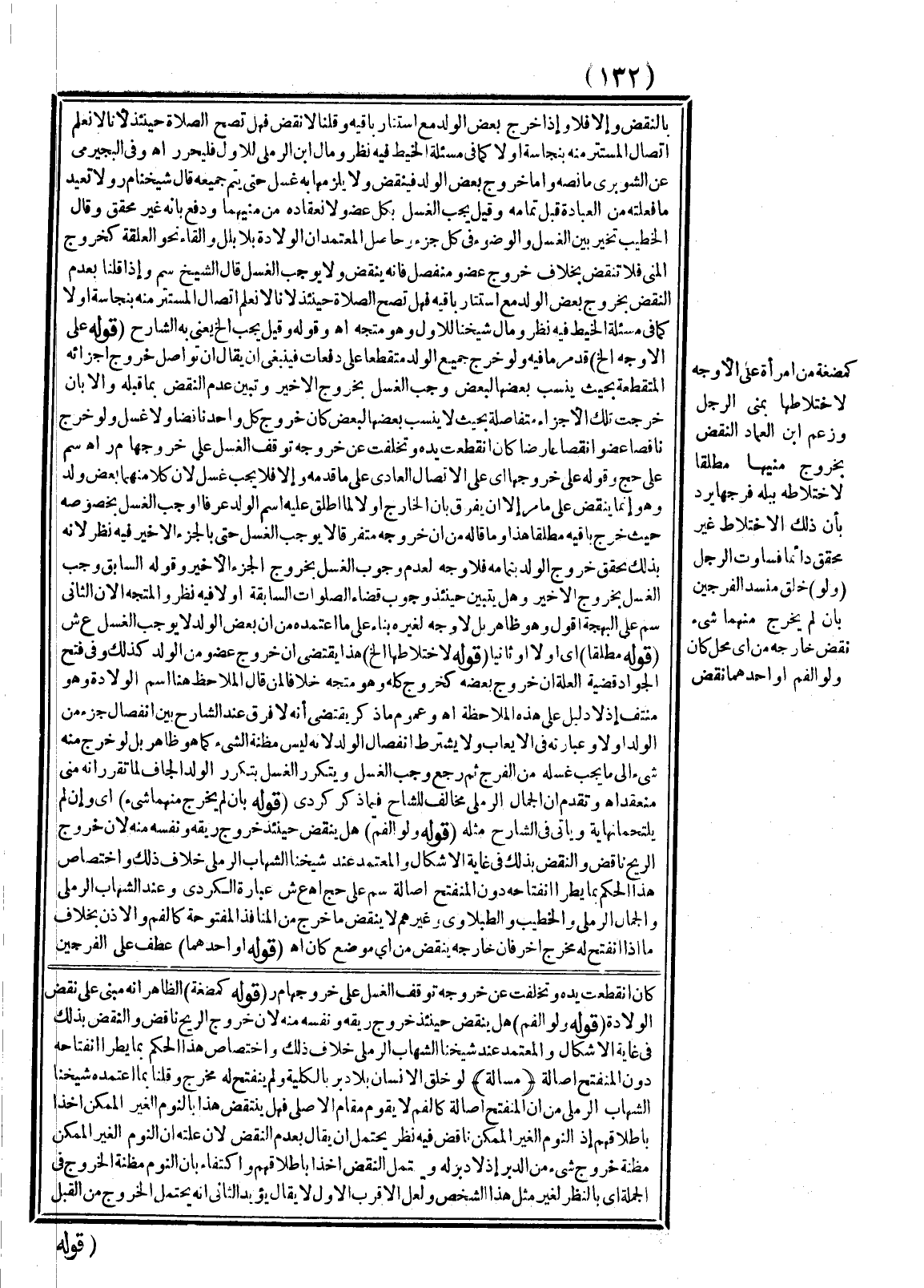 كَمُضْغَةٍ مِنْ امْرَأَةٍ عَلَى الْأَوْجَهِ لِاخْتِلَاطِهَا بِمَنِيِّ الرَّجُلِ وَزَعَمَ ابْنُ الْعِمَادِ النَّقْضَ بِخُرُوجِ مَنِيِّهَا مُطْلَقًا لِاخْتِلَاطِهِ بِبِلَّةِ فَرْجِهَا يُرَدُّ بِأَنَّ ذَلِكَ الِاخْتِلَاطَ غَيْرُ مُحَقَّقٍ دَائِمًا فَسَاوَتْ الرَّجُلَ