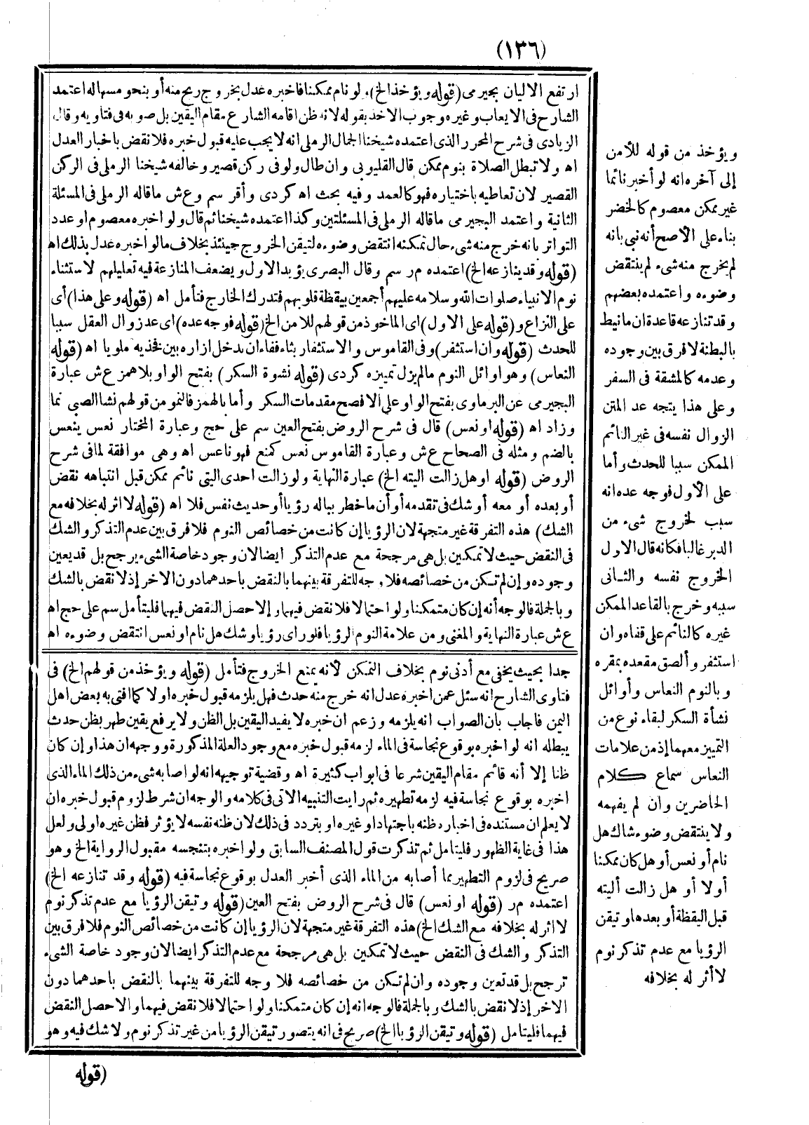 ـــــــــــــــــــــــــــــSجِدًّا بِحَيْثُ يَخْفَى مَعَ أَدْنَى نَوْمٍ بِخِلَافِ التَّمَكُّنِ؛ لِأَنَّهُ يَمْنَعُ الْخُرُوجَ فَتَأَمَّلْ (قَوْلُهُ: وَيُؤْخَذُ مِنْ قَوْلِهِمْ إلَخْ) فِي فَتَاوَى الشَّارِحِ أَنَّهُ سُئِلَ عَمَّنْ أَخْبَرَهُ عَدْلٌ أَنَّهُ خَرَجَ مِنْهُ حَدَثٌ فَهَلْ يَلْزَمُهُ قَبُولُ خَبَرِهِ أَوْ لَا كَمَا أَفْتَى بِهِ بَعْضُ أَهْلِ الْيَمَنِ فَأَجَابَ بِأَنَّ الصَّوَابَ أَنَّهُ يَلْزَمُهُ وَزَعَمَ أَنَّ خَبَرَهُ لَا يُفِيدُ الْيَقِينَ بَلْ الظَّنَّ وَلَا يُرْفَعُ يَقِينُ طُهْرٍ بِظَنِّ حَدَثٍ يُبْطِلُهُ أَنَّهُ لَوْ أَخْبَرَهُ بِوُقُوعِ نَجَاسَةٍ فِي الْمَاءِ لَزِمَهُ قَبُولُ خَبَرِهِ مَعَ وُجُودِ الْعِلَّةِ الْمَذْكُورَةِ وَوَجْهُهُ أَنَّ هَذَا، وَإِنْ كَانَ ظَنًّا إلَّا أَنَّهُ قَائِمٌ مَقَامَ الْيَقِينِ شَرْعًا فِي أَبْوَابٍ كَثِيرَةٍ اهـ.