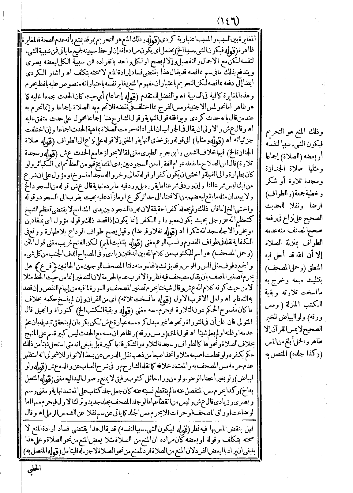 وَذَلِكَ الْمَنْعُ هُوَ التَّحْرِيمُ فَيَكُونُ الشَّيْءُ سَبَبًا لِنَفْسِهِ أَوْ بَعْضِهِ (الصَّلَاةُ) إجْمَاعًا وَمِثْلُهَا صَلَاةُ الْجِنَازَةِ وَسَجْدَةُ تِلَاوَةٍ أَوْ شُكْرٍ وَخُطْبَةِ جُمُعَةٍ (وَالطَّوَافُ) فَرْضًا وَنَفْلًا لِلْحَدِيثِ الصَّحِيحِ عَلَى نِزَاعٍ فِي رَفْعِهِ صَحَّحَ الْمُصَنِّفُ مِنْهُ عَدَمَهُ الطَّوَافُ بِمَنْزِلَةِ الصَّلَاةِ إلَّا أَنَّ اللَّهَ قَدْ أَحَلَّ فِيهِ الْمَنْطِقَ (وَحَمْلُ الْمُصْحَفِ) بِتَثْلِيثِ مِيمِهِ وَخَرَجَ بِهِ مَا نُسِخَتْ تِلَاوَتُهُ وَبَقِيَّةُ الْكُتُبِ الْمُنَزَّلَةِ (وَمَسُّ وَرَقِهِ) وَلَوْ الْبَيَاضَ لِلْخَبَرِ الصَّحِيحِ «لَا يَمَسَّ الْقُرْآنَ إلَّا طَاهِرٌ» وَالْحَمْلُ أَبْلَغُ مِنْ الْمَسِّ (وَكَذَا جِلْدُهُ) الْمُتَّصِلُ بِهِ