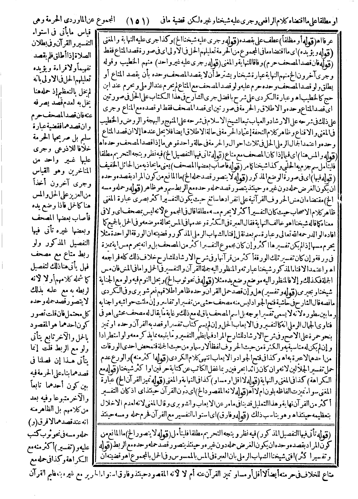 أَوْ مُطْلَقًا عَلَى مَا اقْتَضَاهُ كَلَامُ الرَّافِعِيِّ وَجَرَى عَلَيْهِ شَيْخُنَا وَغَيْرُهُ لَكِنْ قَضِيَّةُ مَا فِي الْمَجْمُوعِ عَنْ الْمَاوَرْدِيِّ الْحُرْمَةُ، وَهِيَ قِيَاسُ مَا يَأْتِي فِي اسْتِوَاءِ التَّفْسِيرِ وَالْقُرْآنِ وَفِي بُطْلَانِ الصَّلَاةِ إذَا أُطْلِقَ فَلَمْ يَقْصِدْ تَفْهِيمًا وَلَا قِرَاءَةً وَيُؤَيِّدُهُ تَعْلِيلُهُمْ الْحِلَّ فِي الْأُولَى بِأَنَّهُ لَمْ يُخِلَّ بِالتَّعْظِيمِ إذْ حَمْلُهُ هُنَا يُخِلُّ بِهِ لِعَدَمِ قَصْدٍ يَصْرِفُهُ عَنْهُ، فَإِنْ قَصَدَ الْمُصْحَفَ حَرُمَ، وَإِنْ قَصَدَهُمَا فَقَضِيَّةُ عِبَارَةِ سُلَيْمٍ بَلْ صَرِيحِهَا الْحُرْمَةُ خِلَافًا لِلْأَذْرَعِيِّ وَجَرَى عَلَيْهَا غَيْرُ وَاحِدٍ مِنْ الْمُتَأَخِّرِينَ.