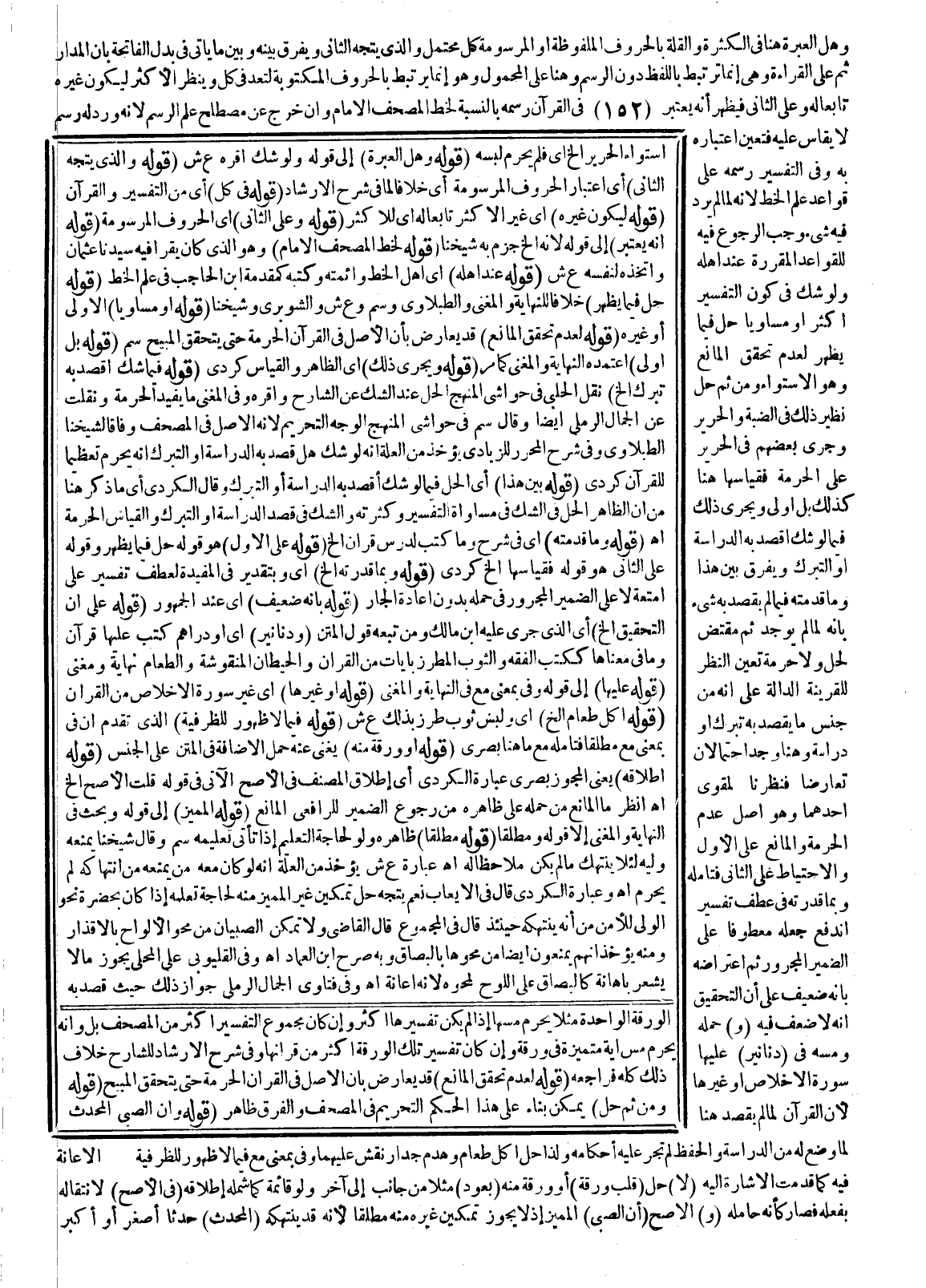 ـــــــــــــــــــــــــــــSالْوَرَقَةَ الْوَاحِدَةَ مَثَلًا يَحْرُمُ مَسُّهَا إذَا لَمْ يَكُنْ تَفْسِيرُهَا أَكْثَرَ، وَإِنْ كَانَ مَجْمُوعُ التَّفْسِيرِ أَكْثَرَ مِنْ الْمُصْحَفِ بَلْ، وَأَنَّهُ يَحْرُمُ مَسُّ آيَةٍ مُتَمَيِّزَةٍ فِي وَرَقَةٍ، وَإِنْ كَانَ تَفْسِيرُ تِلْكَ الْوَرَقَةِ أَكْثَرَ مِنْ قُرْآنِهَا وَفِي شَرْحِ الْإِرْشَادِ لِلشَّارِحِ خِلَافُ ذَلِكَ كُلِّهِ فَرَاجِعْهُ (قَوْلُهُ: لِعَدَمِ تَحَقُّقِ الْمَانِعِ) قَدْ يُعَارَضُ بِأَنَّ الْأَصْلَ فِي الْقُرْآنِ الْحُرْمَةُ حَتَّى يَتَحَقَّقَ الْمُبِيحُ (قَوْلُهُ: وَمِنْ ثَمَّ حَلَّ) يُمْكِنُ بِنَاءً عَلَى هَذَا الْحُكْمِ التَّحْرِيمُ فِي الْمُصْحَفِ وَالْفَرْقُ ظَاهِرٌ