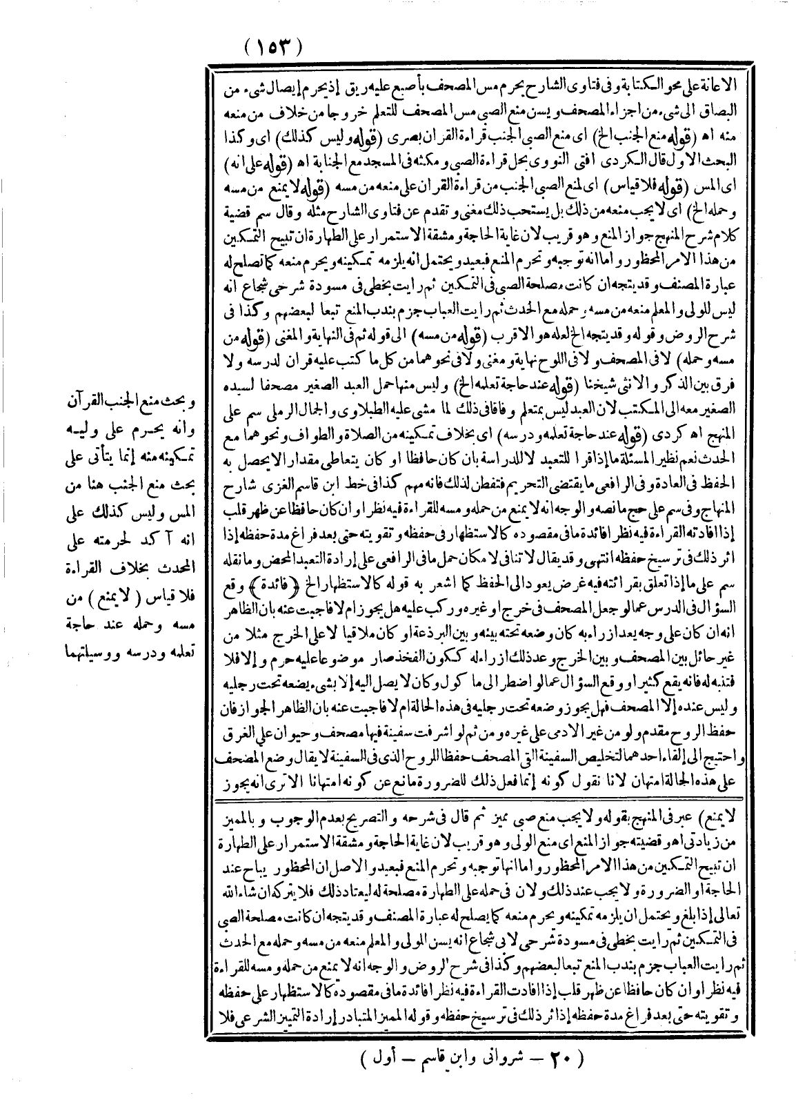 وَبَحْثُ مَنْعِ الْجُنُبِ الْقُرْآنَ، وَأَنَّهُ يَحْرُمُ عَلَى وَلِيِّهِ تَمْكِينُهُ مِنْهُ إنَّمَا يَتَأَتَّى عَلَى بَحْثِ مَنْعِ الْجُنُبِ هُنَا مِنْ الْمَسِّ وَلَيْسَ كَذَلِكَ عَلَى أَنَّهُ آكَدُ لِحُرْمَتِهِ عَلَى الْمُحْدِثِ بِخِلَافِ الْقِرَاءَةِ فَلَا قِيَاسَ (لَا يُمْنَعُ) مِنْ مَسِّهِ وَحَمْلِهِ عِنْدَ حَاجَةِ تَعَلُّمِهِ وَدَرْسِهِ وَوَسِيلَتِهِمَا