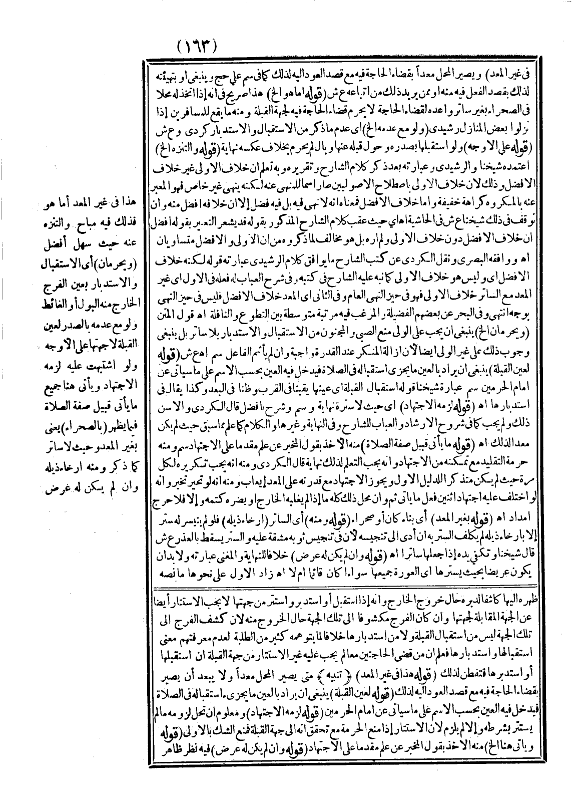 ـــــــــــــــــــــــــــــSظَهْرَهُ إلَيْهَا كَاشِفًا لِدُبُرِهِ حَالَ خُرُوجِ الْخَارِجِ، وَأَنَّهُ إذَا اسْتَقْبَلَ أَوْ اسْتَدْبَرَ وَاسْتَتَرَ مِنْ جِهَتِهَا لَا يَجِبُ الِاسْتِتَارُ أَيْضًا عَنْ الْجِهَةِ الْمُقَابِلَةِ لِجِهَتِهَا، وَإِنْ كَانَ الْفَرْجُ مَكْشُوفًا إلَى تِلْكَ الْجِهَةِ حَالَ الْخُرُوجِ مِنْهُ؛ لِأَنَّ كَشْفَ الْفَرْجِ إلَى تِلْكَ الْجِهَةِ لَيْسَ مِنْ اسْتِقْبَالِ الْقِبْلَةِ وَلَا مِنْ اسْتِدْبَارِهَا خِلَافًا لِمَا يَتَوَهَّمُهُ كَثِيرٌ مِنْ الطَّلَبَةِ لِعَدَمِ مَعْرِفَتِهِمْ مَعْنَى اسْتِقْبَالِهَا وَاسْتِدْبَارِهَا فَعُلِمَ أَنَّ مَنْ قَضَى الْحَاجَتَيْنِ مَعًا لَمْ يَجِبْ عَلَيْهِ غَيْرُ الِاسْتِتَارِ مِنْ جِهَةِ الْقِبْلَةِ إنْ اسْتَقْبَلَهَا أَوْ اسْتَدْبَرَهَا فَتَفَطَّنْ لِذَلِكَ (قَوْلُهُ: هَذَا فِي غَيْرِ الْمُعَدِّ) (تَنْبِيهٌ)