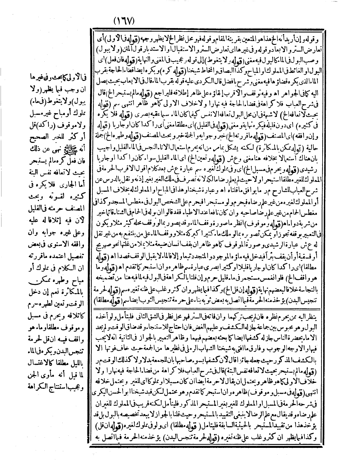 وَعِبَارَةُ شَيْخِنَا وَهَذَا فِي الْمُبَاحِ أَوْ الْمَمْلُوكِ لَهُ بِخِلَافِ الْمُسَبَّلِ أَوْ الْمَمْلُوكِ لِغَيْرِهِ مِنْ غَيْرِ عِلْمِ رِضَاهُ فَيَحْرُمُ وَلَوْ مُسْتَبْحِرًا فَيَحْرُمُ عَلَى الشَّخْصِ الْبَوْلُ فِي مَغْطِسِ الْمَسْجِدِ وَكَذَا فِي مَغْطِسِ الْحَمَّامِ مِنْ غَيْرِ عِلْمِ رِضَا صَاحِبِهِ، وَإِنْ كَانَ نَافِعًا عِنْدَ الْأَطِبَّاءِ فَقَدْ قَالُوا إنَّ بَوْلَةً فِي الْحَمَّامِ فِي الشِّتَاءِ قَائِمًا خَيْرٌ مِنْ شَرْبَةِ دَوَاءٍ اهـ.