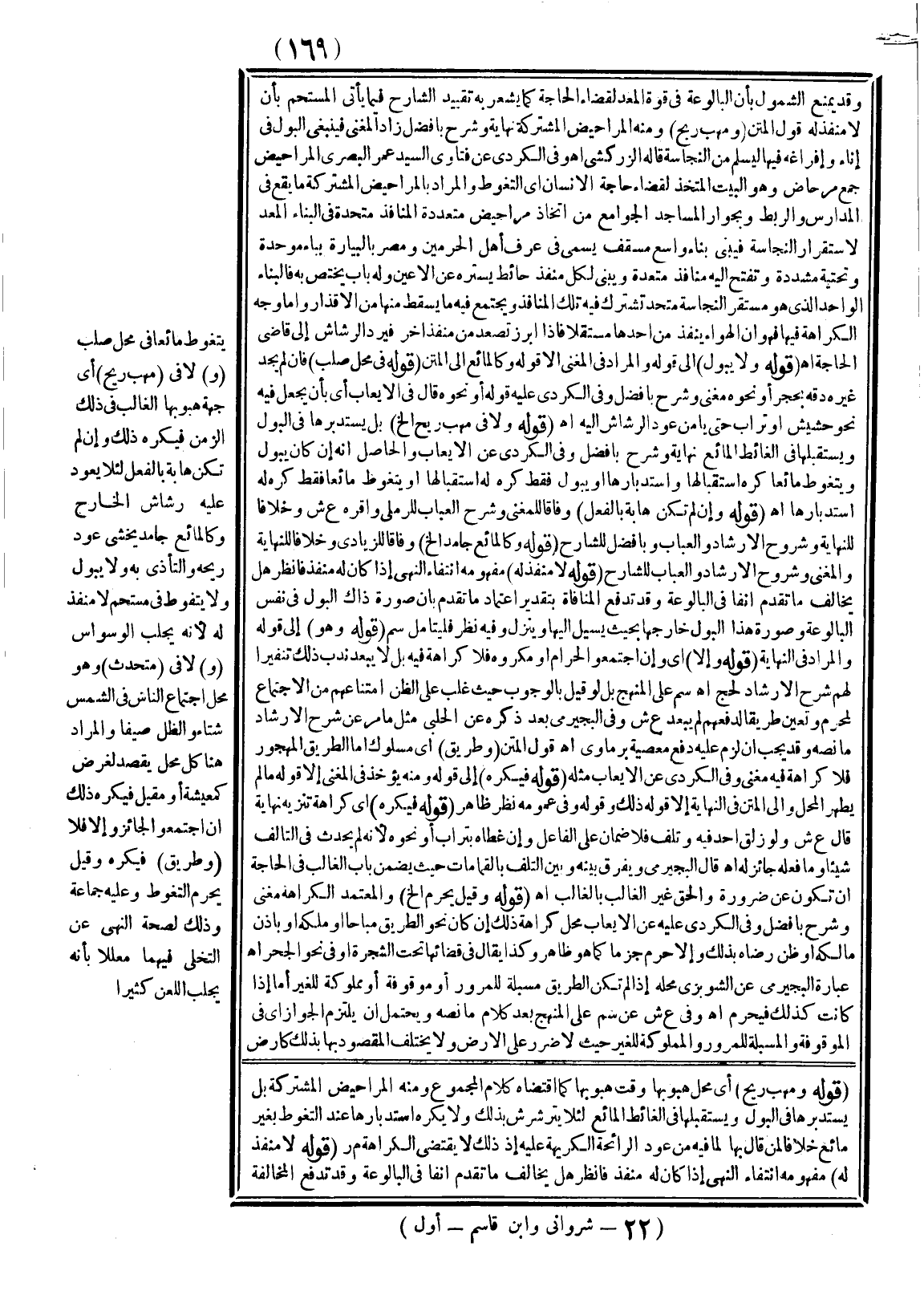 وَفِي الْكُرْدِيِّ عَنْ فَتَاوَى السَّيِّدِ عُمَرَ الْبَصْرِيِّ الْمَرَاحِيضُ جَمْعُ مِرْحَاضٍ، وَهُوَ الْبَيْتُ الْمُتَّخَذُ لِقَضَاءِ حَاجَةِ الْإِنْسَانِ أَيْ التَّغَوُّطِ وَالْمُرَادُ بِالْمَرَاحِيضِ الْمُشْتَرَكَةِ مَا يَقَعُ فِي الْمَدَارِسِ وَالرُّبُطِ وَبِجِوَارِ الْمَسَاجِدِ الْجَوَامِعِ مِنْ اتِّخَاذِ مَرَاحِيضَ مُتَعَدِّدَةِ الْمَنَافِذِ مُتَّحِدَةٍ فِي الْبِنَاءِ الْمُعَدِّ لِاسْتِقْرَارِ النَّجَاسَةِ فَيُبْنَى بِنَاءٌ وَاسِعٌ مُسَقَّفٌ يُسَمَّى فِي عُرْفِ أَهْلِ الْحَرَمَيْنِ وَمِصْرَ بِالْبَيَّارَةِ بِبَاءٍ مُوَحَّدَةٍ وَتَحْتِيَّةٍ مُشَدَّدَةٍ وَتُفْتَحُ إلَيْهِ مَنَافِذُ مُتَعَدِّدَةٌ وَيُبْنَى لِكُلِّ مَنْفَذٍ حَائِطٌ يَسْتُرُهُ عَنْ الْأَعْيَنِ وَلَهُ بَابٌ يَخْتَصُّ بِهِ فَالْبِنَاءُ الْوَاحِدُ الَّذِي هُوَ مُسْتَقَرُّ النَّجَاسَةِ مُتَّحِدٌ تَشْتَرِك فِيهِ تِلْكَ الْمَنَافِذُ، وَيَجْتَمِعُ فِيهِ مَا يَسْقُطُ مِنْهَا مِنْ الْأَقْذَارِ.