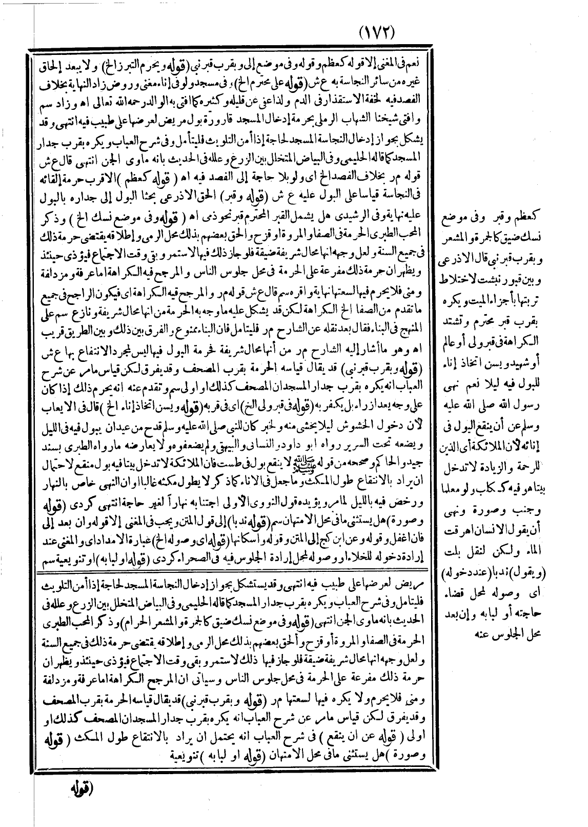ـــــــــــــــــــــــــــــQنَعَمْ فِي الْمُغْنِي إلَّا قَوْلَهُ كَعَظْمٍ وَقَوْلُهُ وَفِي مَوْضِعٍ إلَى وَبِقُرْبِ قَبْرِ نَبِيٍّ (قَوْلُهُ: وَيَحْرُمُ التَّبَرُّزُ إلَخْ) وَلَا يَبْعُدُ إلْحَاقُ غَيْرِهِ مِنْ سَائِرِ النَّجَاسَةِ بِهِ ع ش (قَوْلُهُ: عَلَى مُحْتَرَمٍ إلَخْ) وَفِي مَسْجِدٍ وَلَوْ فِي إنَاءٍ مُغْنِي وَرَوْضٍ زَادَ النِّهَايَةُ بِخِلَافِ الْفَصْدِ فِيهِ لِخِفَّةِ الِاسْتِقْذَارِ فِي الدَّمِ وَلِذَا عُفِيَ عَنْ قَلِيلِهِ وَكَثِيرِهِ كَمَا أَفْتَى بِهِ الْوَالِدُ - رَحِمَهُ اللَّهُ تَعَالَى - اهـ وَزَادَ سم وَأَفْتَى شَيْخُنَا الشِّهَابُ الرَّمْلِيُّ بِحُرْمَةِ إدْخَالِ الْمَسْجِدِ قَارُورَةَ بَوْلِ مَرِيضٍ لِعَرْضِهَا عَلَى طَبِيبٍ فِيهِ انْتَهَى وَقَدْ يَشْكُلُ بِجَوَازِ إدْخَالِ النَّجَاسَةِ الْمَسْجِدَ لِحَاجَةٍ إذَا أَمِنَ التَّلْوِيثَ فَلْيُتَأَمَّلْ وَفِي شَرْحِ الْعُبَابِ وَيُكْرَهُ بِقُرْبِ جِدَارِ الْمَسْجِدِ كَمَا قَالَهُ الْحَلِيمِيُّ وَفِي الْبَيَاضِ الْمُتَخَلِّلِ بَيْنَ الزَّرْعِ وَعَلَّلَهُ فِي الْحَدِيثِ بِأَنَّهُ مَأْوَى الْجِنِّ انْتَهَى اهـ.